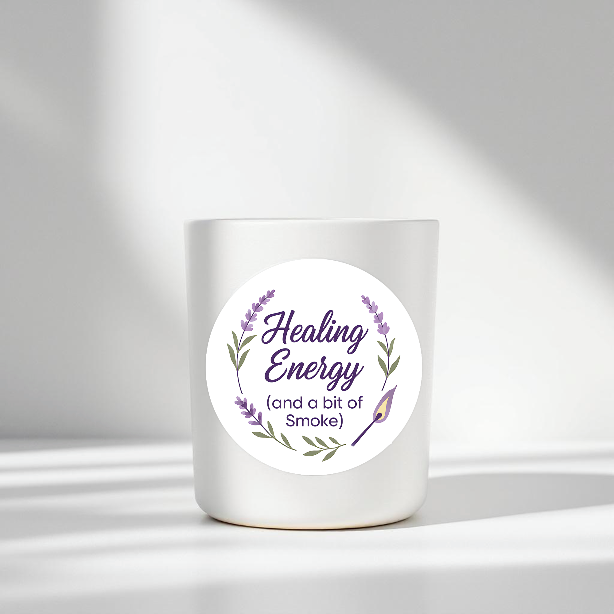Bring a touch of calm and humour to your candle collection with this “Healing Energy (and a Bit of Smoke)” sticker. Featuring soft lavender sprigs and a glowing match illustration, this design perfectly blends self-care, spirituality, and a little sass. Ideal for aromatherapy candles, reiki gifts, or wellness product packaging.