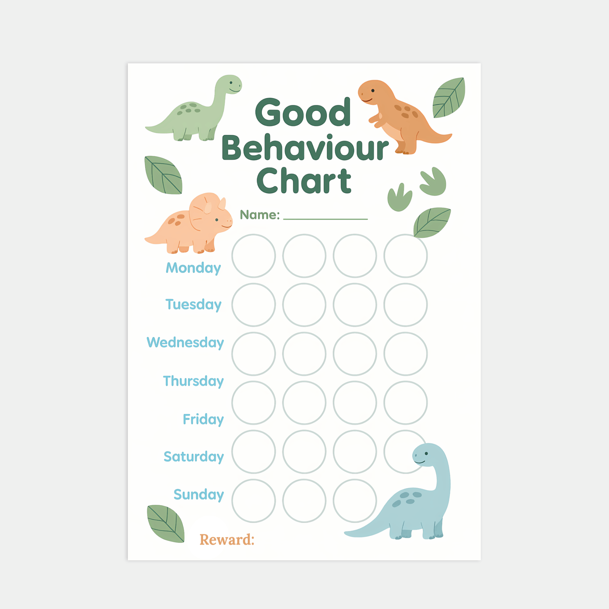 This Dinosaur-themed Reward Chart makes good behaviour fun and motivating for little dino fans. Perfect for tracking bedtime, chores, manners, or any positive habit — at home, school, or daycare.