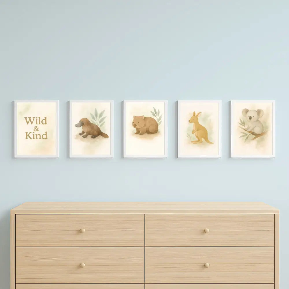 Bring the magic of the Australian bush into your home with this gentle watercolour wall art collection, featuring five beautifully illustrated designs, Kangaroo, Koala, Platypus, Wombat, and the inspiring quote “Wild & Kind.”