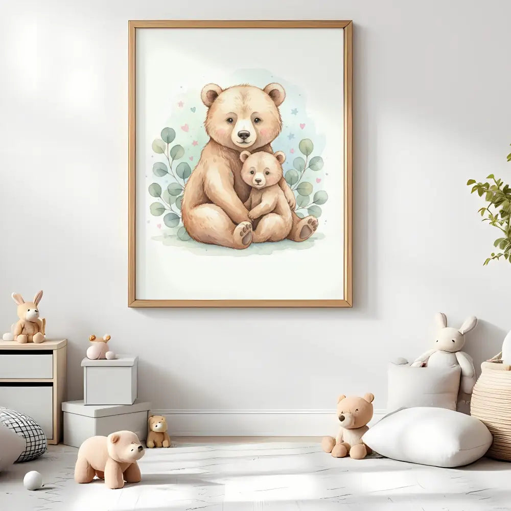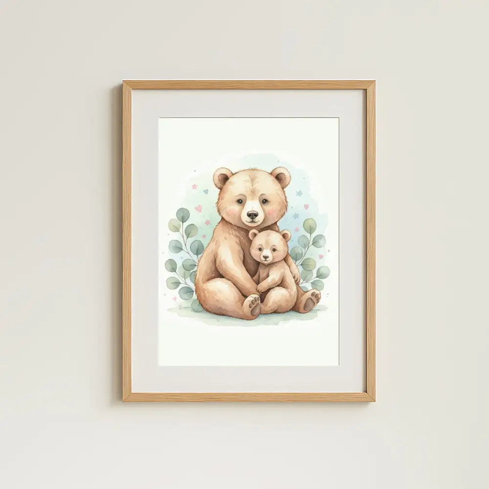 Create a warm and loving nursery with this gentle Baby Bear & Cub wall art print, featuring a sweet mother (or father) bear cuddling her baby in soft watercolor tones. Perfect for woodland, neutral, or gender-neutral nursery themes, this tender illustration brings comfort, security, and timeless charm to any baby’s room. Designed to create a peaceful and soothing space, it makes a beautiful addition to a child’s bedroom or a thoughtful baby shower gift.