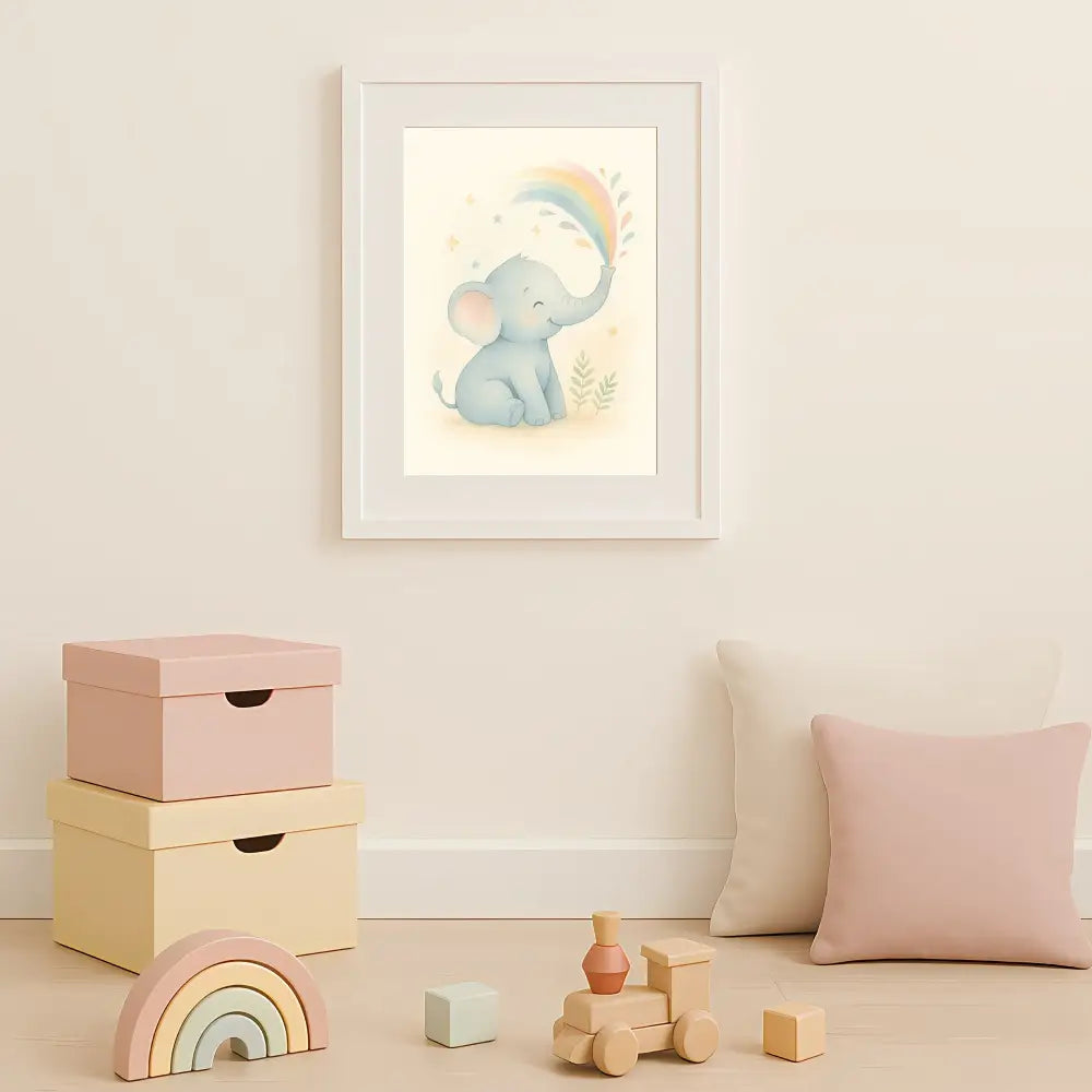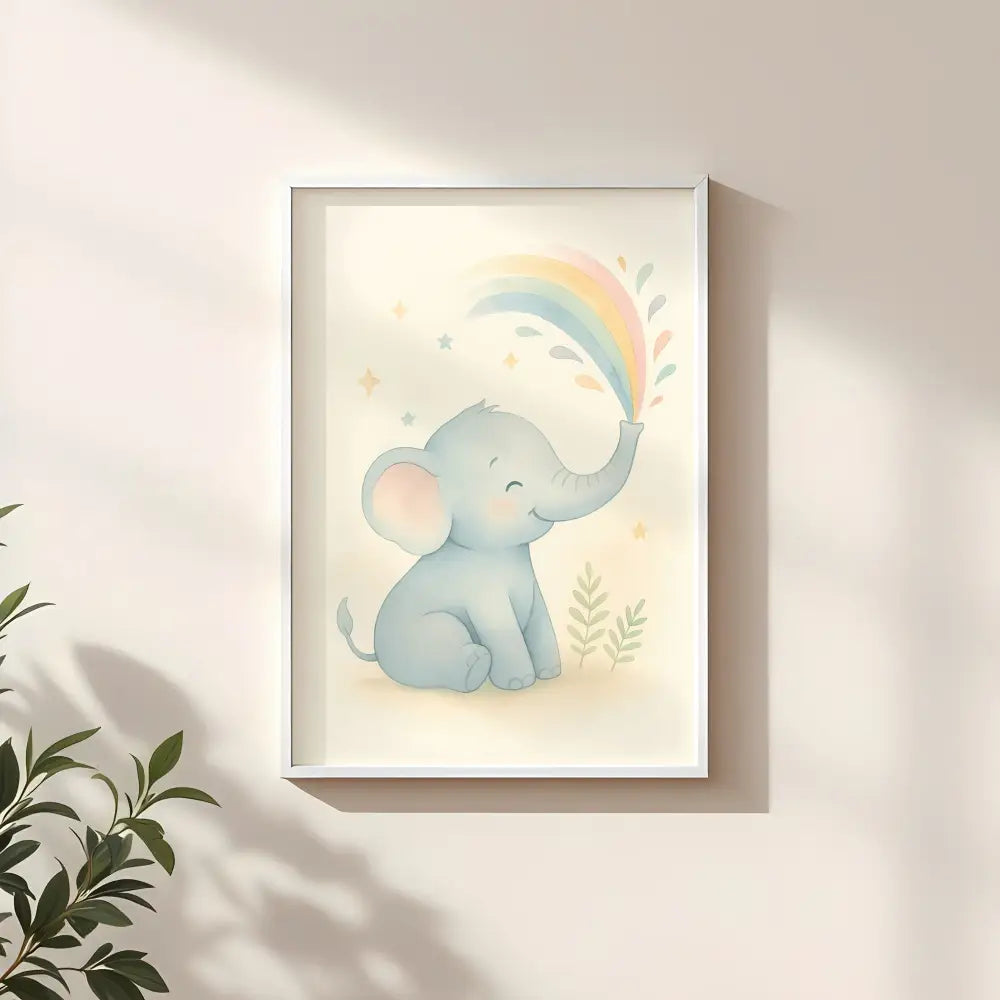 Add a splash of joy to your child’s room with this Little Elephant Nursery Wall Art Print, featuring an adorable baby elephant playfully spraying a rainbow from its trunk.