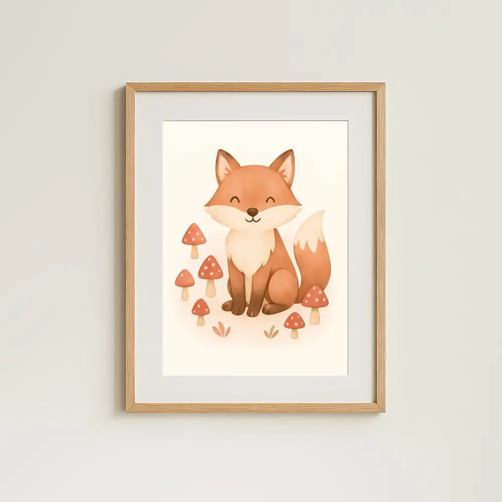 Bring a touch of woodland wonder into your home with this gentle watercolour Fox wall art, a sweet, smiling friend surrounded by toadstools, perfect for a cosy nursery, playroom, or child’s bedroom.