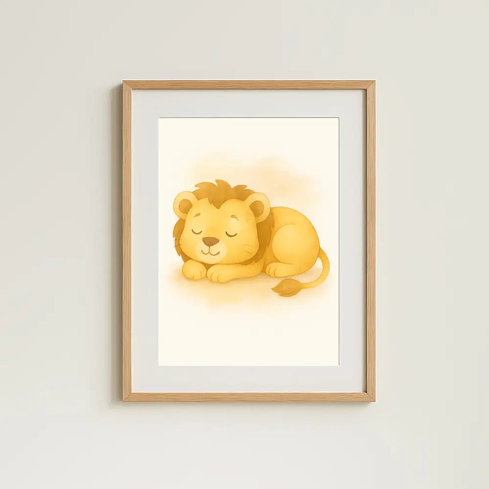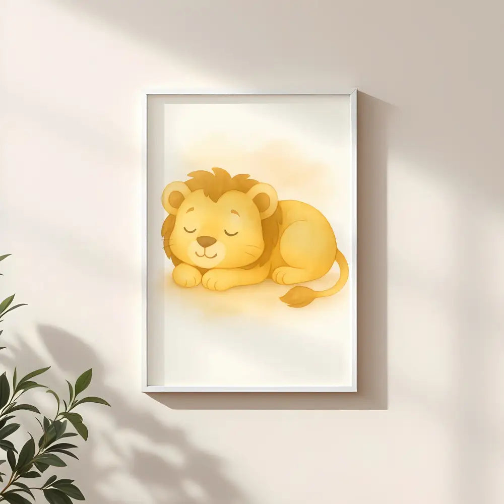 Bring warmth and courage to your nursery with this Little Lion Nursery Wall Art Print, featuring a sweet, sleepy lion cub resting peacefully in soft golden tones.