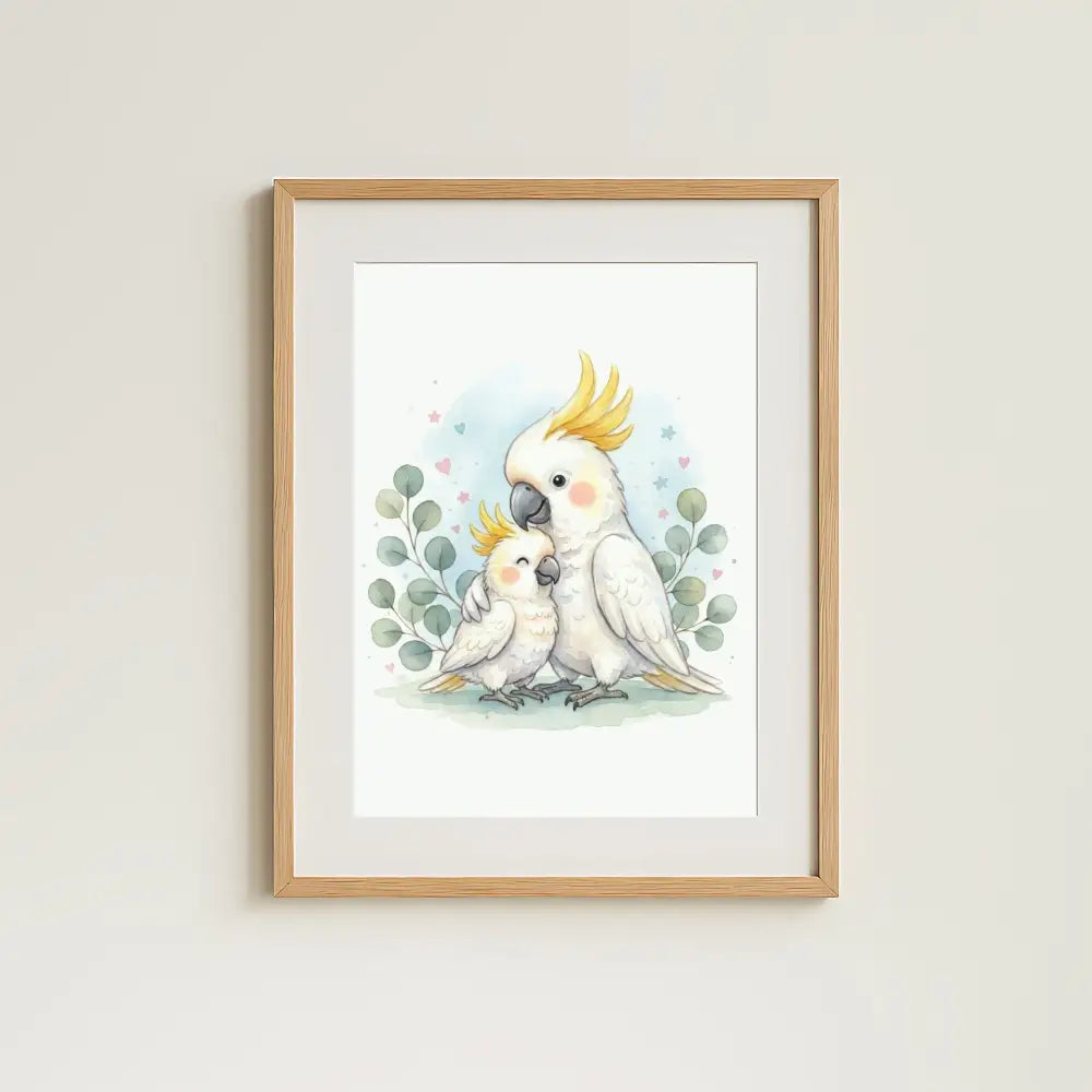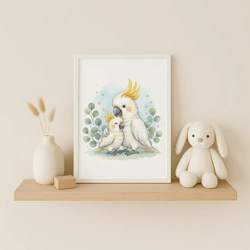 Perfect for nurseries, kids’ bedrooms, playrooms, reading nooks, or thoughtful baby shower gifts, this soft and loving cockatoo illustration brings Australian wildlife and gentle storytelling charm into any room.