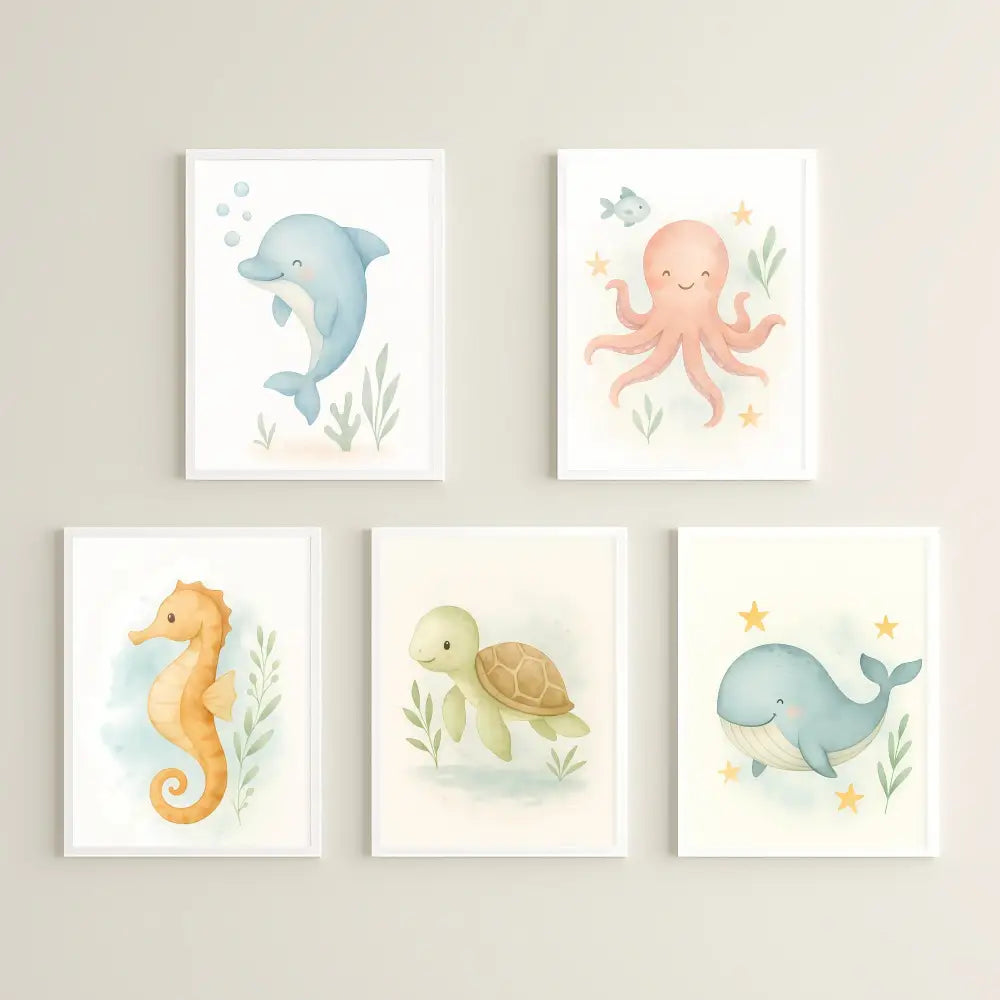 Ocean Nursery Wall Art Set – Whale, Dolphin, Octopus, Seahorse & Turtle | PDF Printable Digital Download