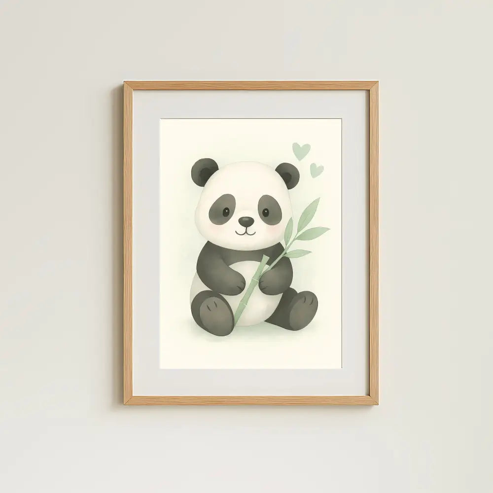 Add a touch of gentle charm to your nursery with this Little Panda Nursery Wall Art Print, featuring a cute panda holding a bamboo shoot surrounded by soft green leaves and hearts.