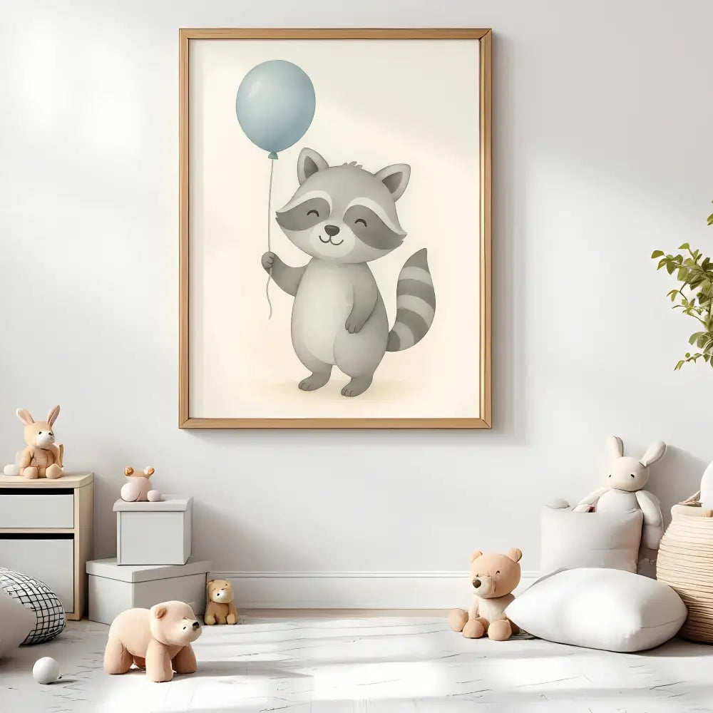 Add a touch of woodland charm to your nursery with this Raccoon Nursery Wall Art Print, featuring a sweet raccoon holding a soft blue balloon.