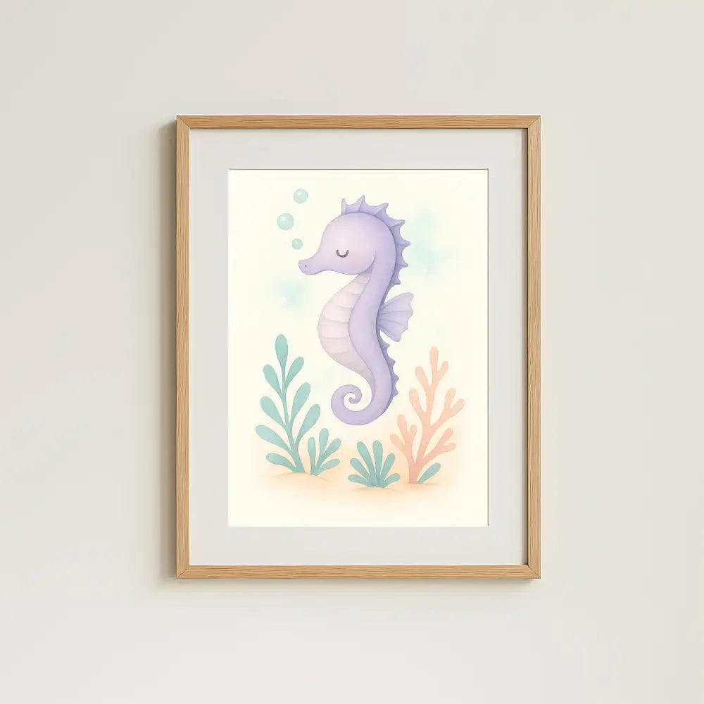 Add a peaceful coastal touch to your nursery with this Little Seahorse Nursery Wall Art Print, featuring a gentle lavender seahorse floating gracefully among coral and sea plants.