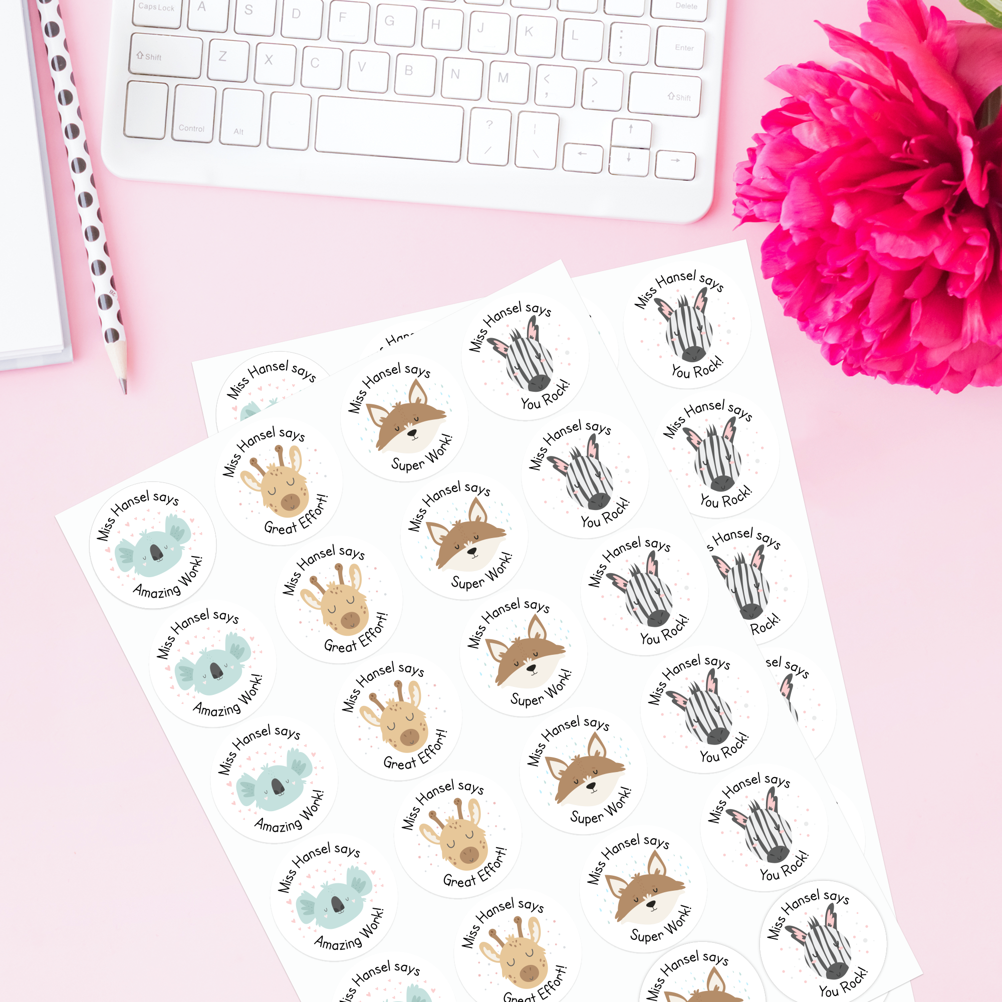 Personalised Teacher Reward Stickers Custom Name Label Cute Pastel Animals