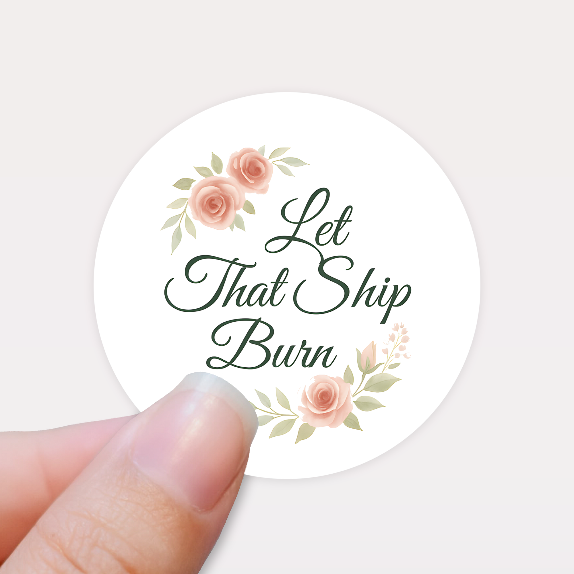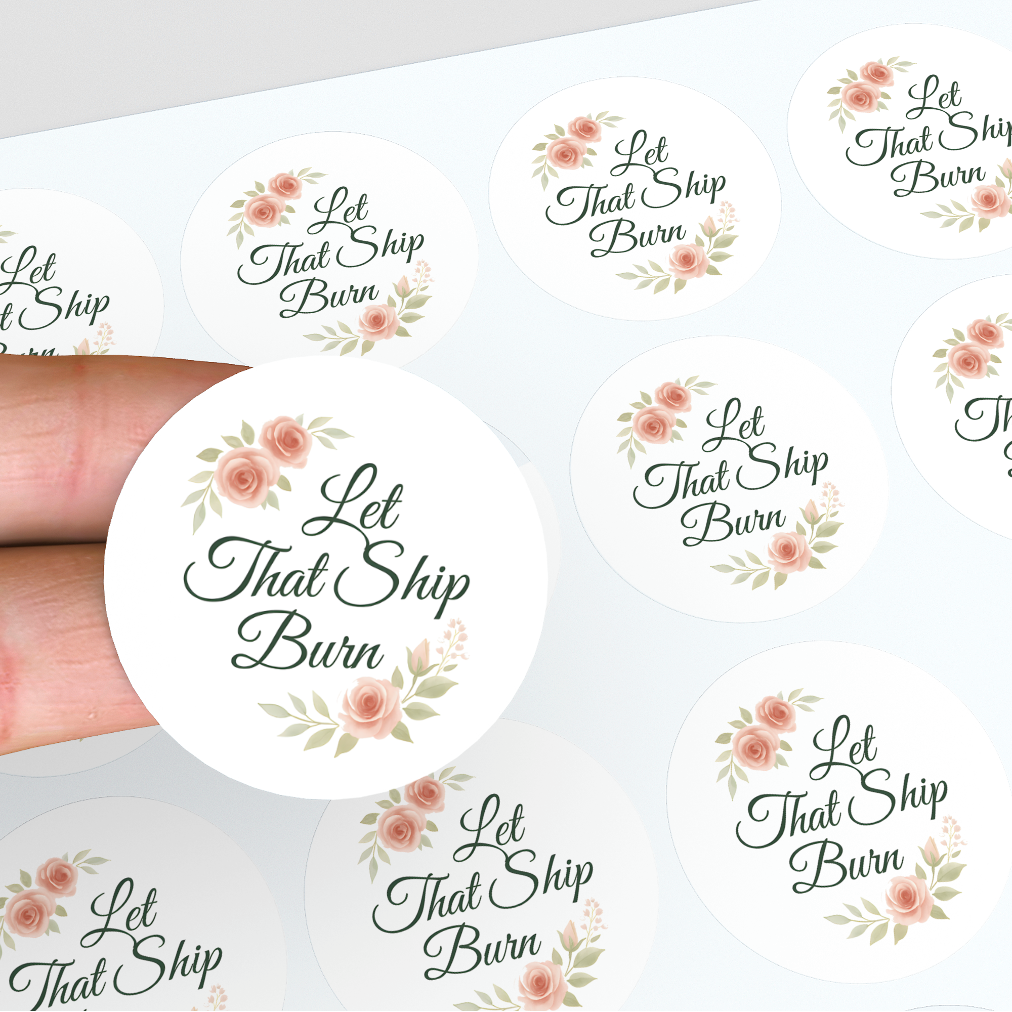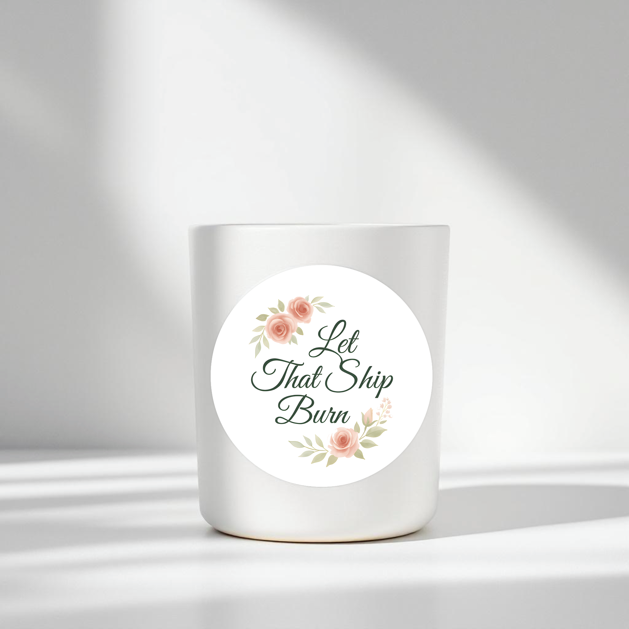 This “Let That Ship Burn” candle sticker pairs elegant script typography with soft blush florals — a perfect mix of class and sass. It’s the ultimate statement piece for breakup candles, self-love gifts, or anyone ready to move on in style.