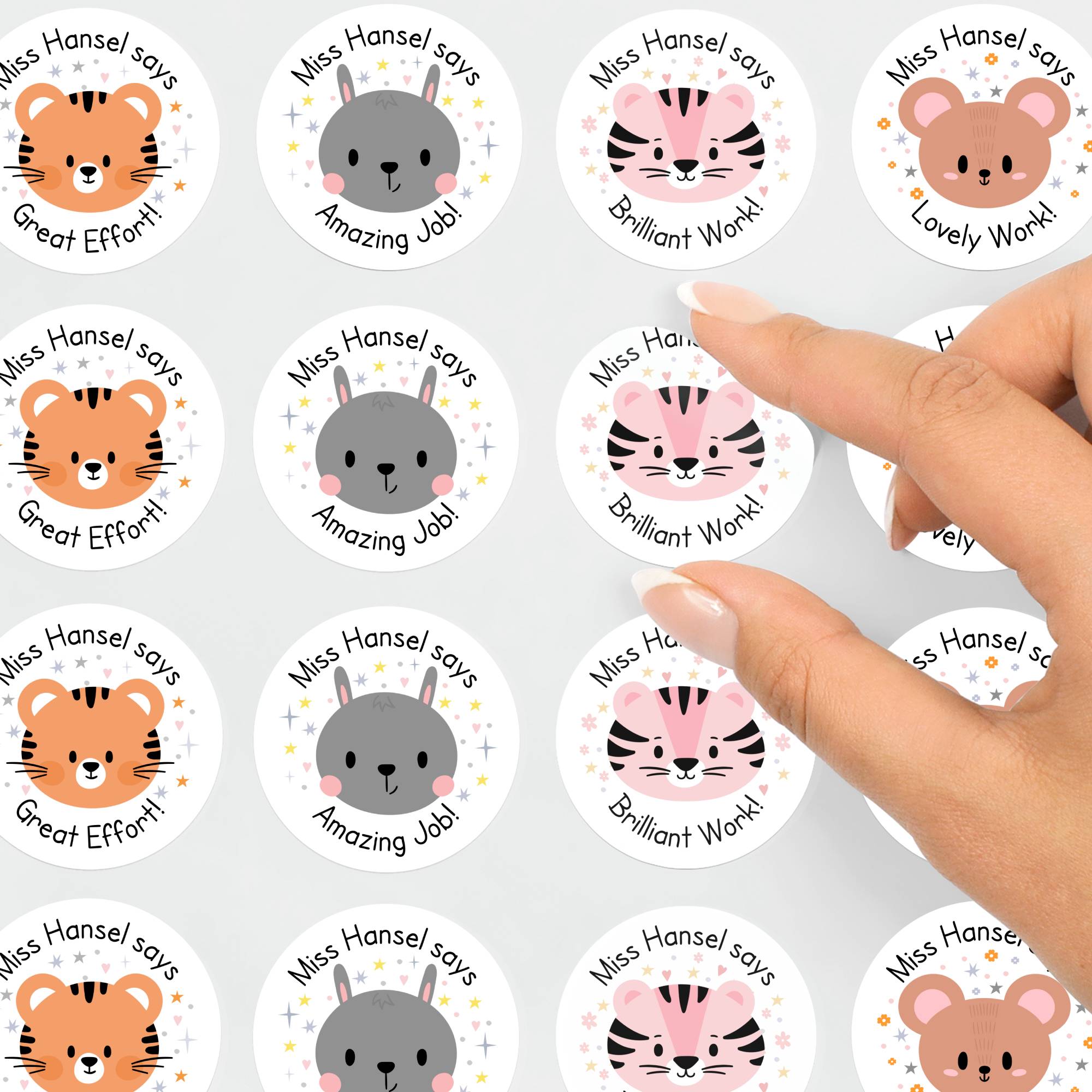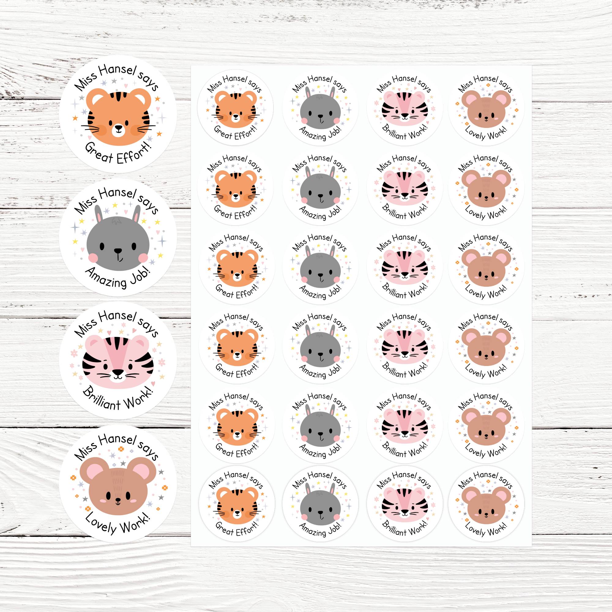 Includes 4 unique cute designs: Tiger – “Great Effort!”, Mouse – “Lovely Work!”, Rabbit – “Amazing Job!” and Pink Tiger – “Brilliant Work!”.