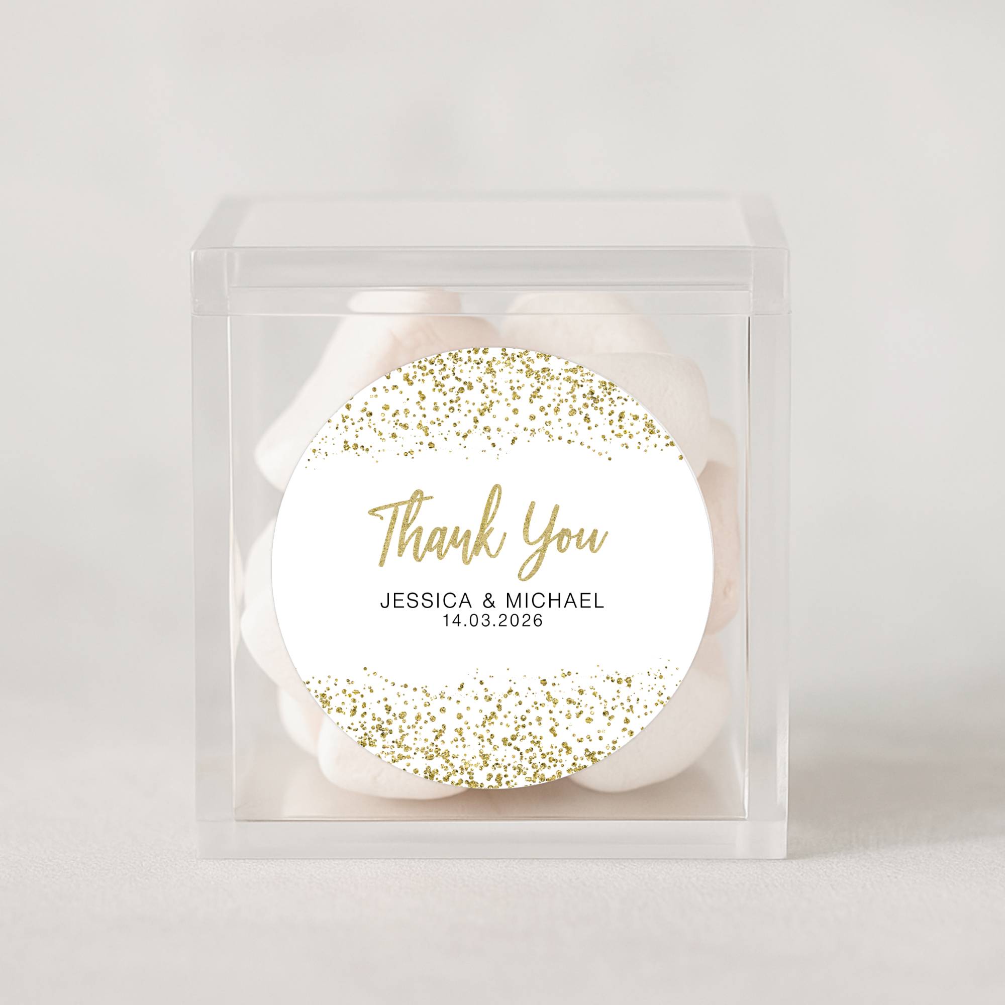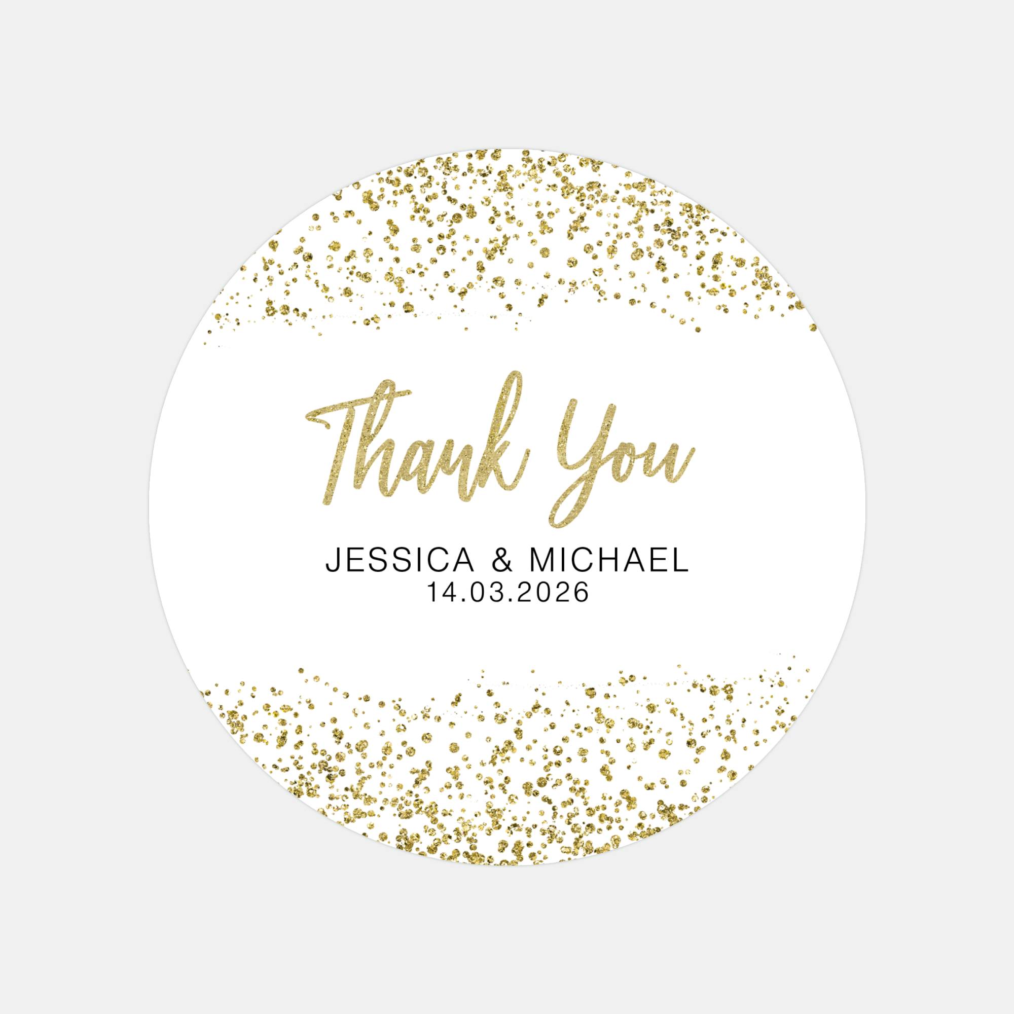 Each round sticker features a gold glitter confetti design with your names and wedding date beautifully printed in matching script and modern fonts.
