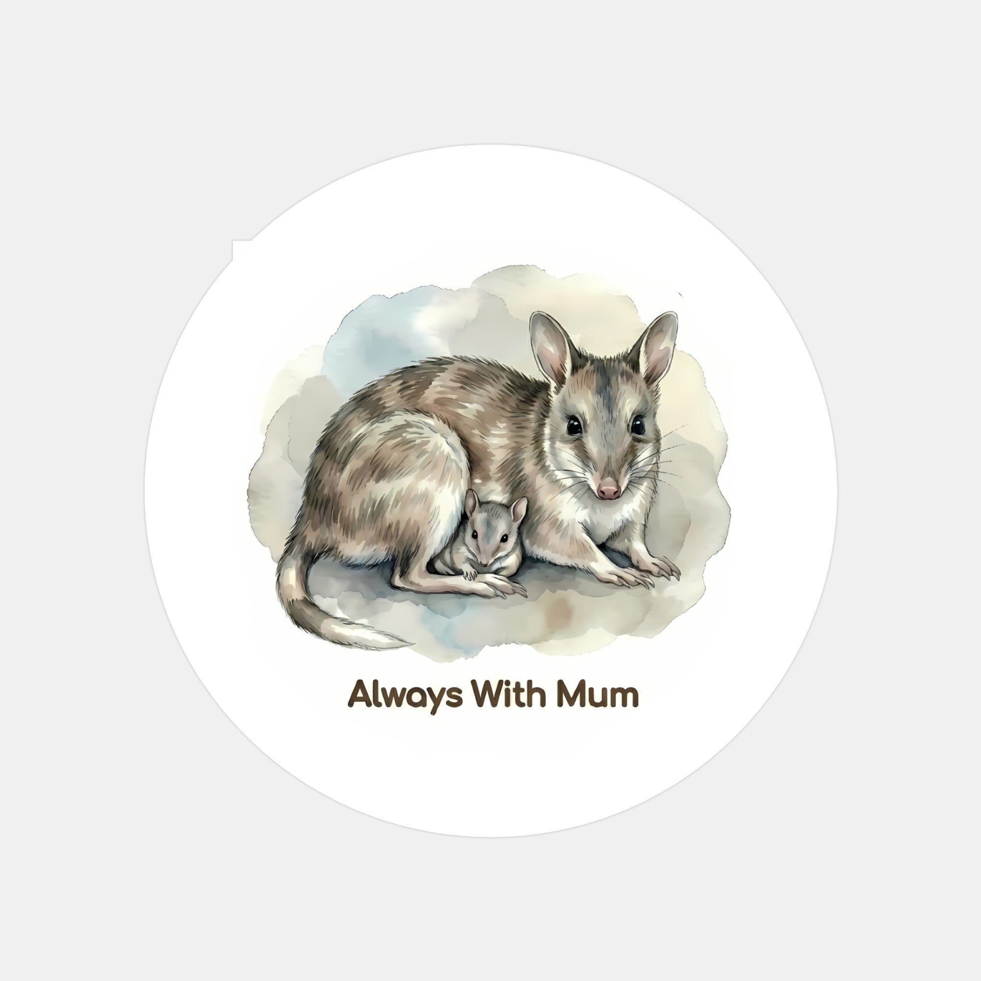 Celebrate the unbreakable bond between mother and young with this “Always With Mum” Eastern Barred Bandicoot sticker. Featuring a gentle watercolour illustration of a mother bandicoot sheltering her joey close, this design captures comfort, protection, and the quiet strength of Tasmanian wildlife.