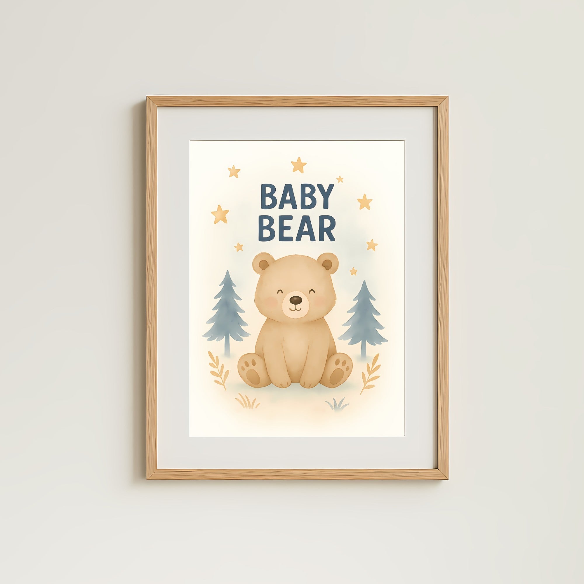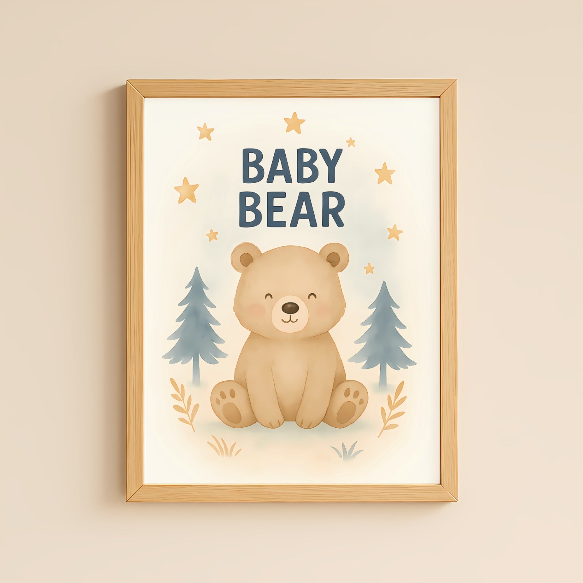 Bring warmth and charm to your nursery with this adorable Baby Bear wall art print. Featuring a smiling bear surrounded by stars and pines, this gentle woodland design adds a cosy, gender-neutral touch to your baby’s room. Perfect as a gift or instant printable for your little cub’s space.