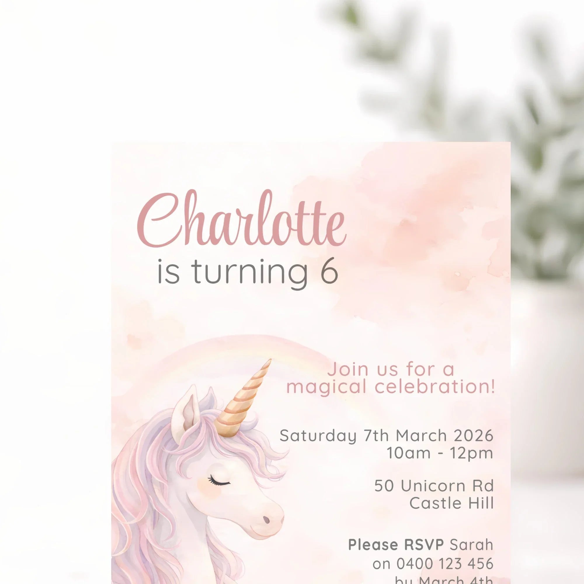 This soft watercolour design features a graceful unicorn in gentle blush and pastel tones, accented with subtle florals and a dreamy background. With its calm colour palette and refined layout, this invitation is perfect for children who love unicorns, soft pinks, and fairy-tale magic.