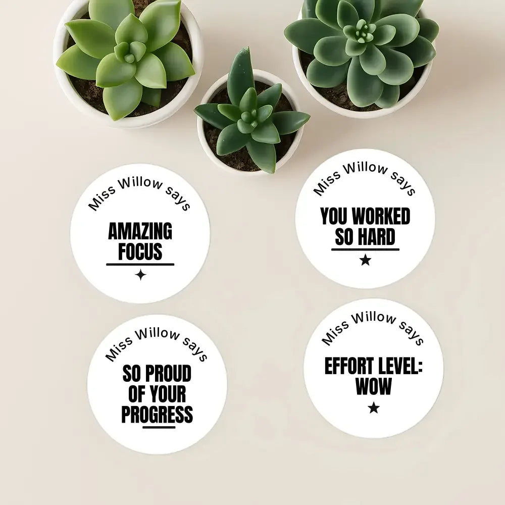 Each sticker includes your personalised name (e.g. “Miss Willow says”), adding a professional yet relatable touch that fits perfectly in high school or upper primary classrooms.