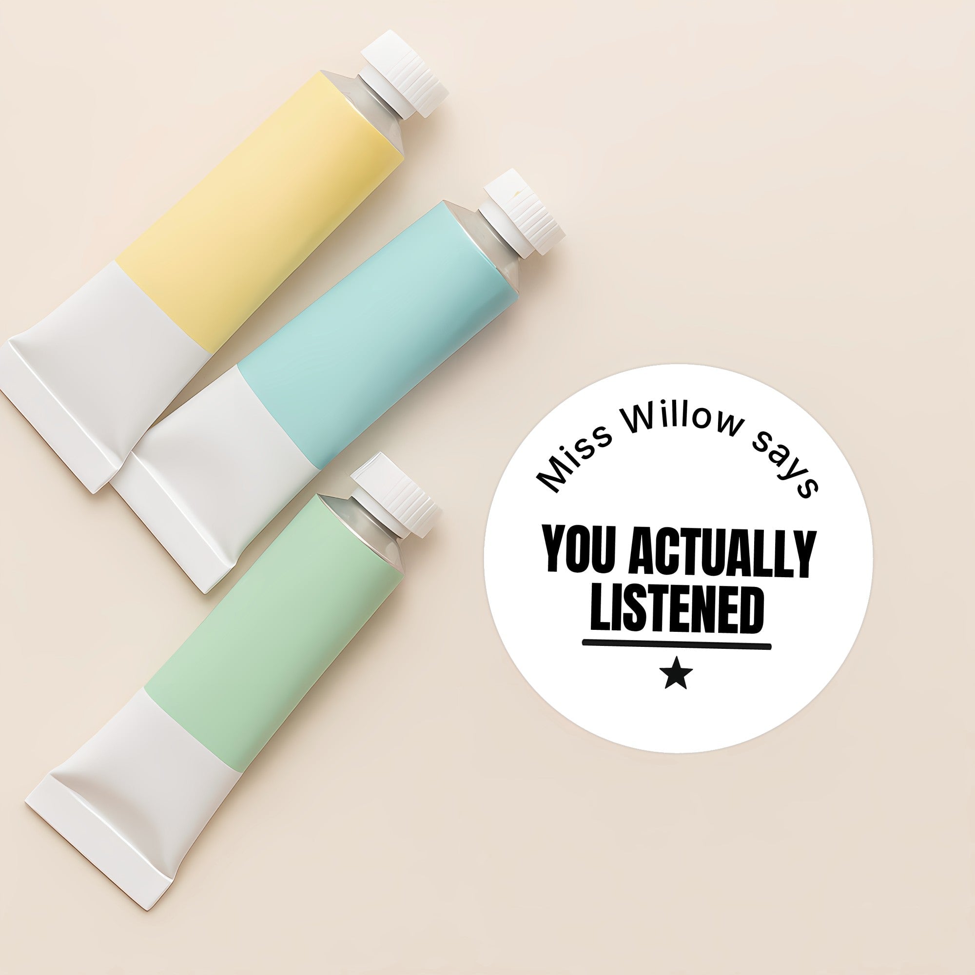 Each sticker is personalised with your name (e.g. “Miss Willow says”), creating a professional yet relatable touch that fits effortlessly into high school and upper primary classrooms.