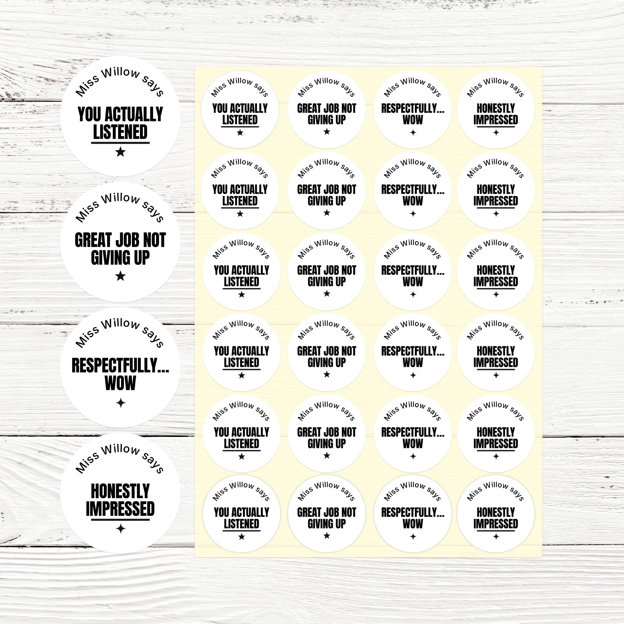 Bring humour and honesty into behaviour management with these bold minimalist teen behaviour stickers. Designed with strong black typography and clean modern layout, each sticker features a dry-humour phrase like “You actually listened”, “Honestly impressed”, “Great job not giving up” and “Respectfully… wow”. Perfect for teens who appreciate sarcasm over kiddie praise.