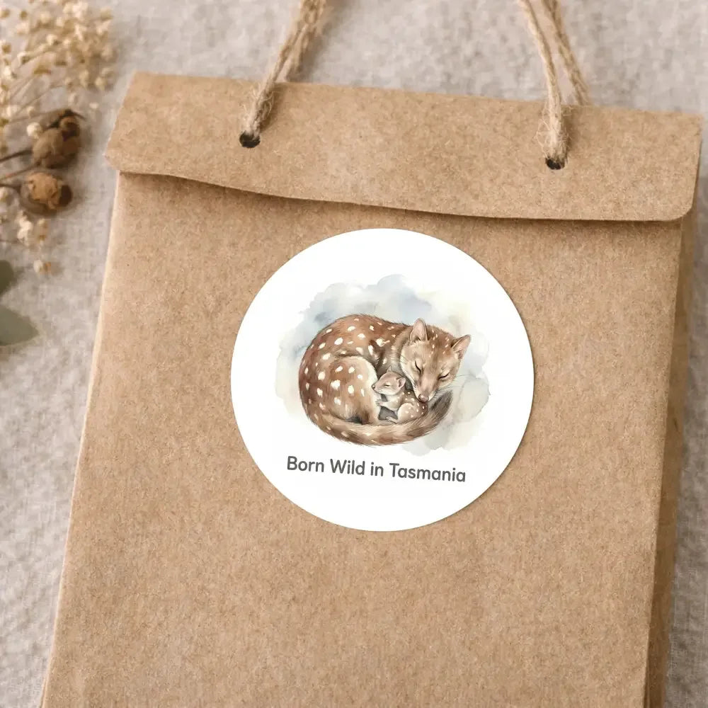 Celebrate Tasmania’s wild heart with these premium “Born Wild in Tasmania” Tasmanian quoll stickers. Featuring a softly detailed watercolour illustration of a mother quoll curled protectively around her joey, this design honours native wildlife, place, and the quiet strength of maternal bonds.