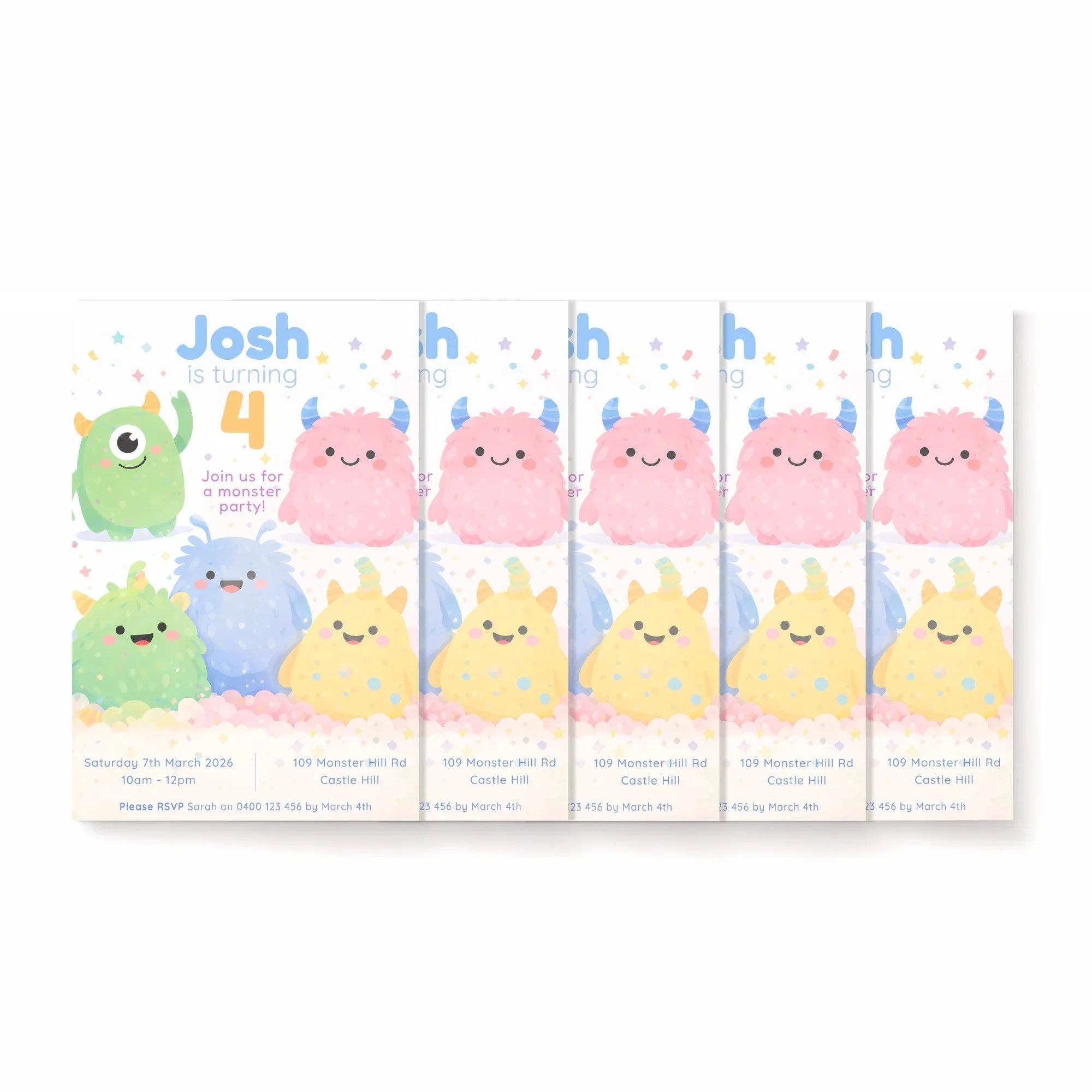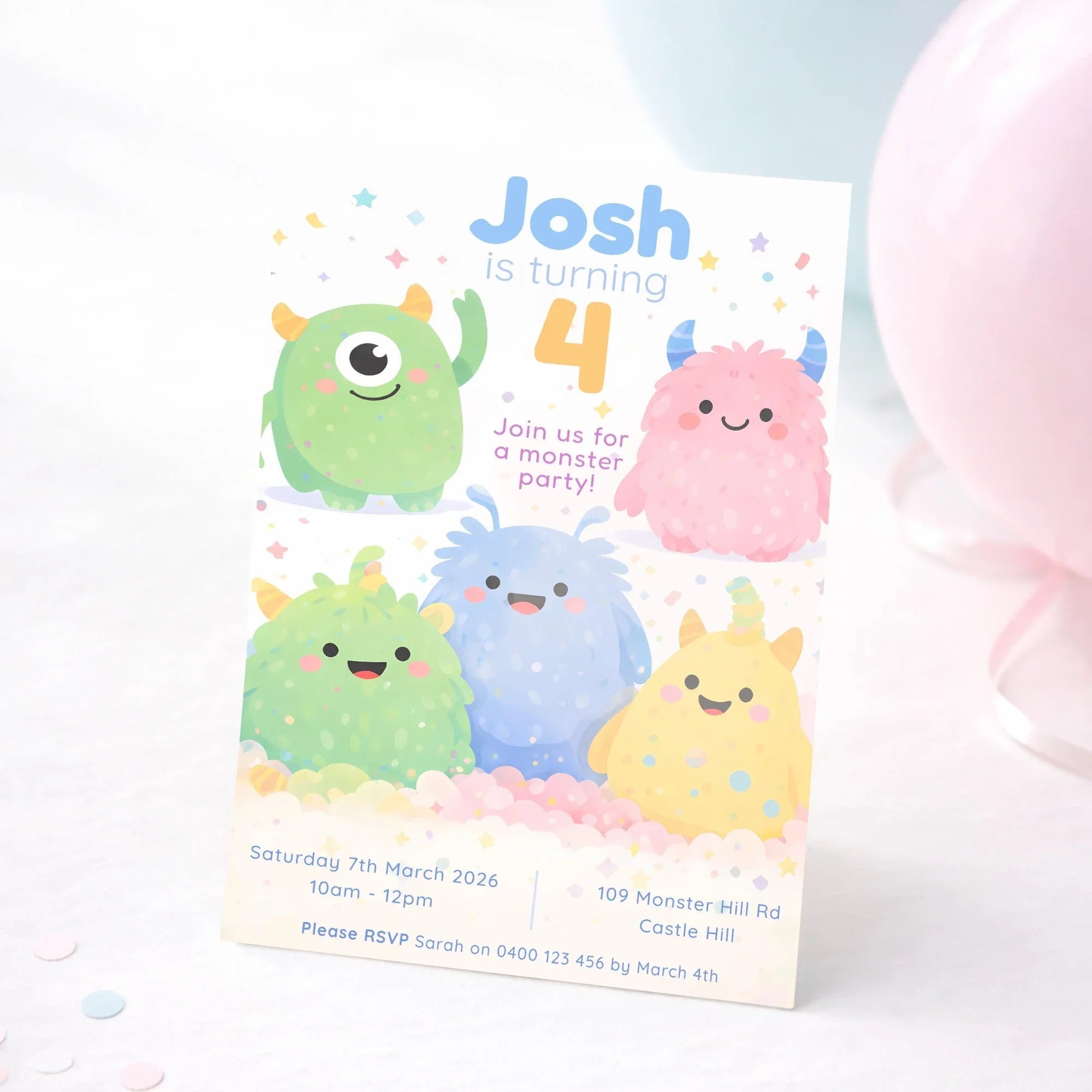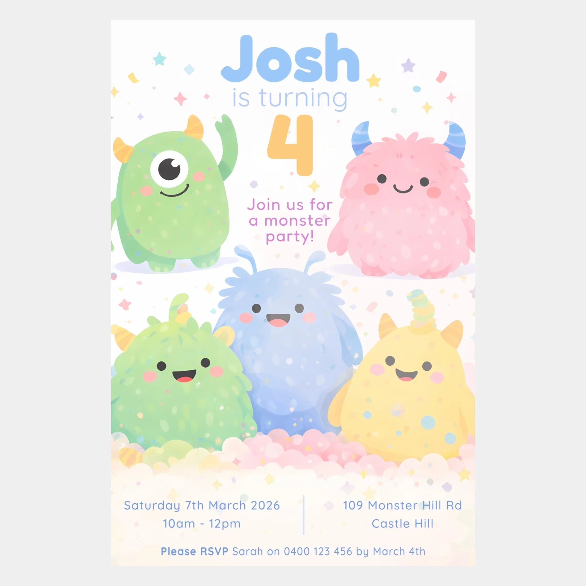 Featuring a group of adorable, friendly monsters in soft pastel colours, this playful design is perfect for little ones who love cute characters without anything scary. The happy expressions, confetti details, and clean layout create a joyful invitation that’s easy to read and full of personality.