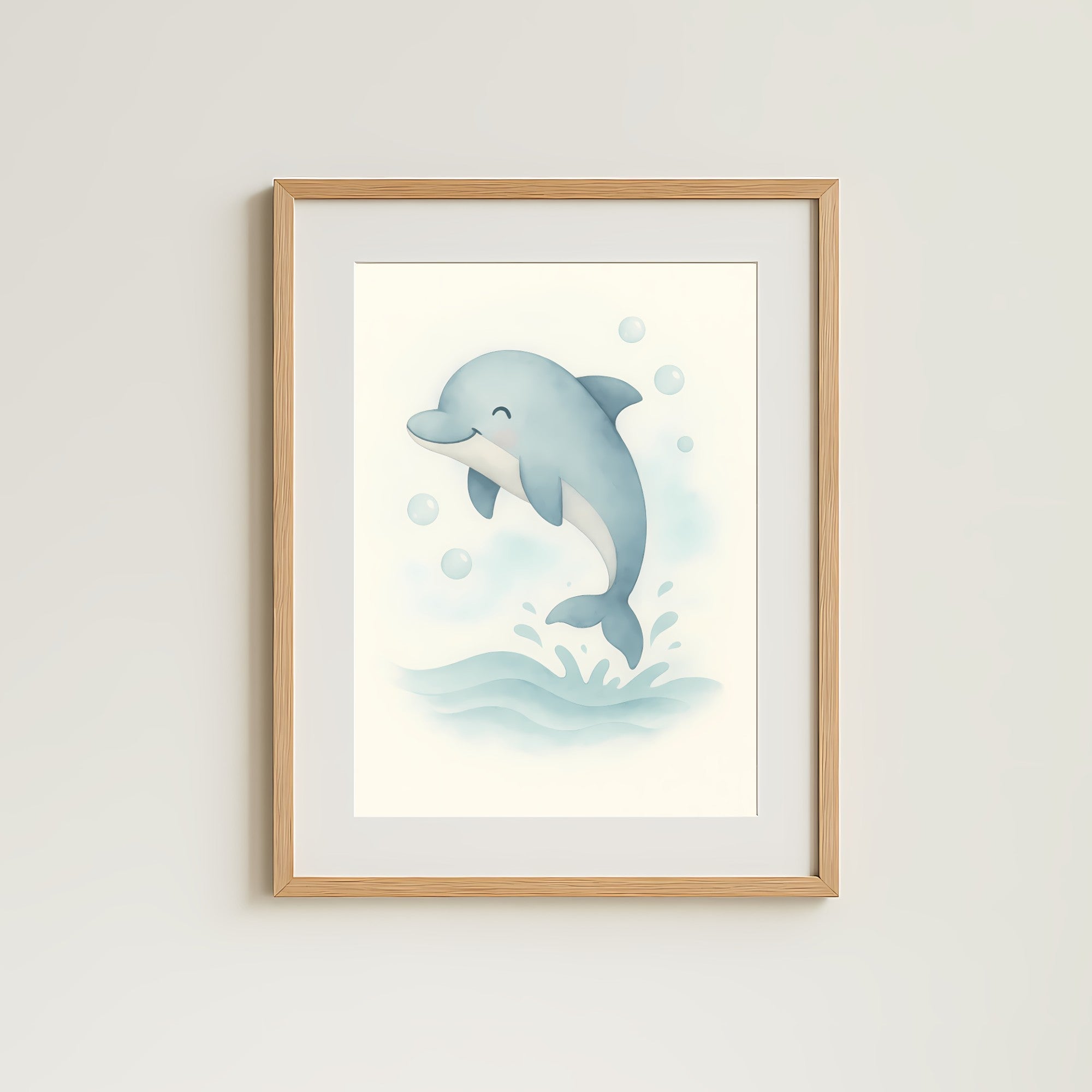 Illustrated in a hand painted digital watercolour style, this artwork captures the happiness and playfulness of the sea, making it a perfect choice for a nursery, playroom, or child’s bedroom. The soft blue tones and calming water theme suit coastal, beach, and Scandi inspired interiors, creating a bright and uplifting atmosphere.