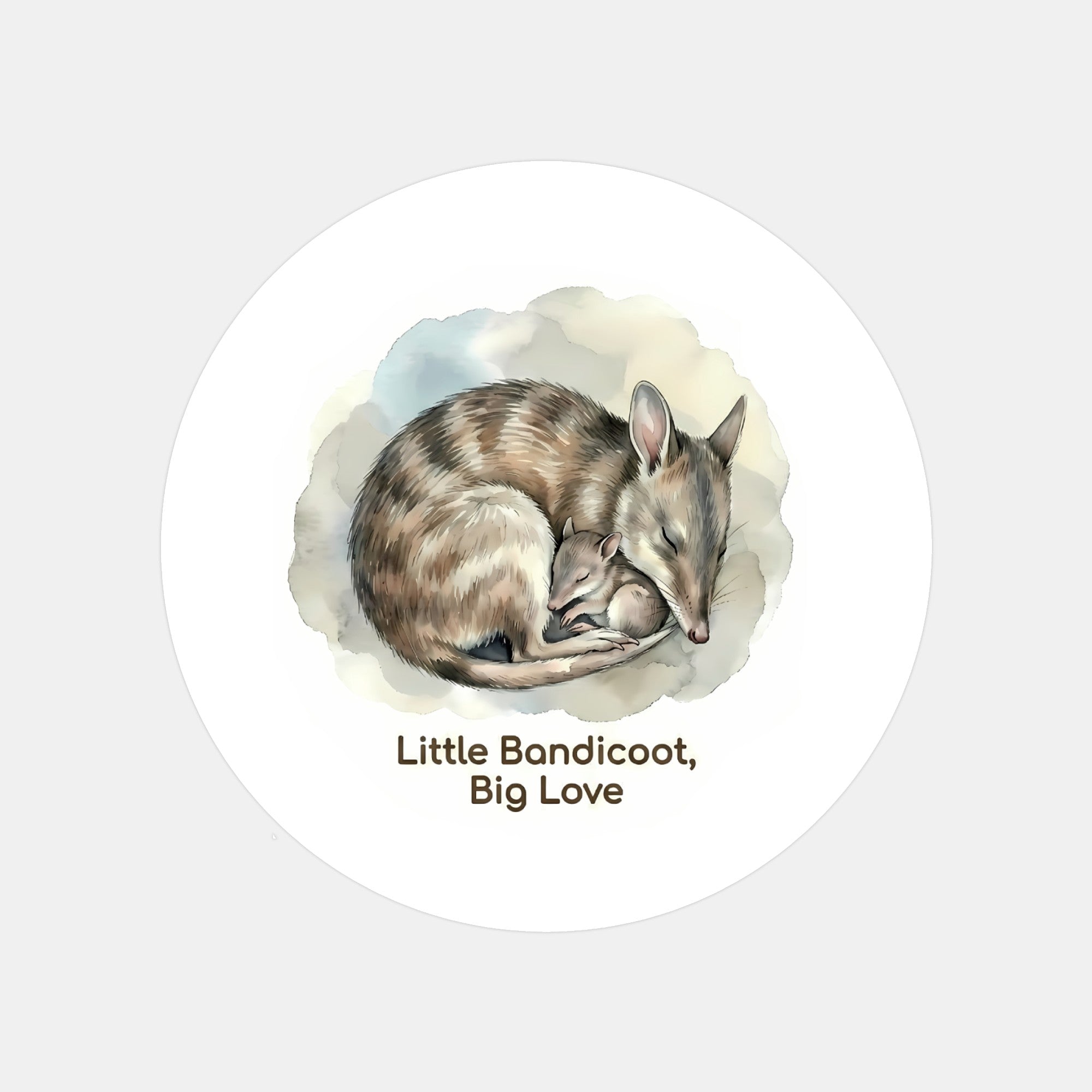 Celebrate the quiet tenderness of one of Tasmania’s most beloved native animals with this “Little Bandicoot, Big Love” Eastern Barred Bandicoot sticker. Featuring a soft watercolour illustration of a mother bandicoot curled protectively around her joey, this design captures warmth, safety, and the powerful bond between parent and young.