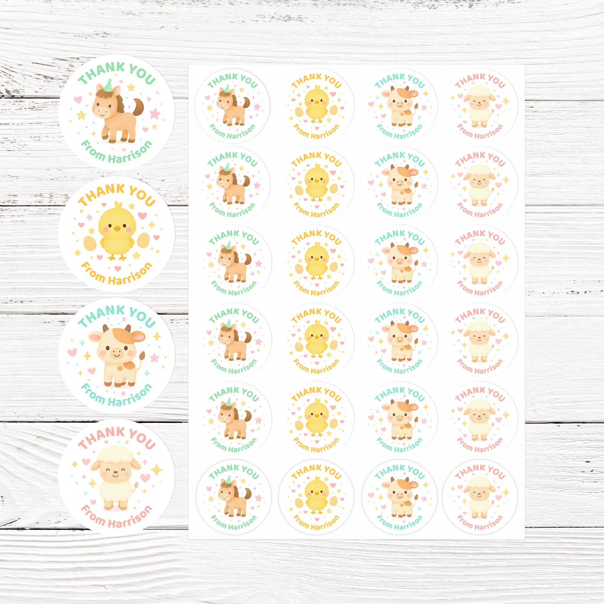 Farm Animal Thank You Stickers – Horse, Sheep, Chick & Cow | Personalised Party Favour Labels