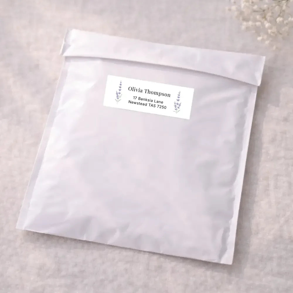 Featuring delicate lavender illustrations, a clean white background, and classic typography, this design offers a timeless, calming aesthetic, perfect for weddings, handmade brands, and thoughtful everyday mail.