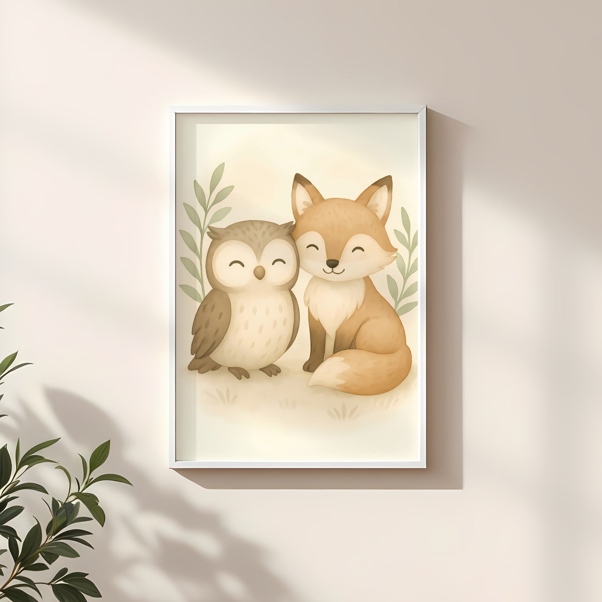 Fox and Owl Nursery Wall Art Print | Woodland Animal Watercolour | Digital Download