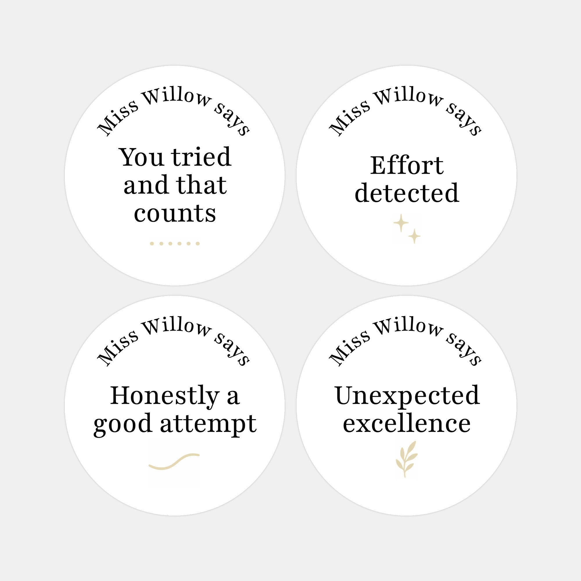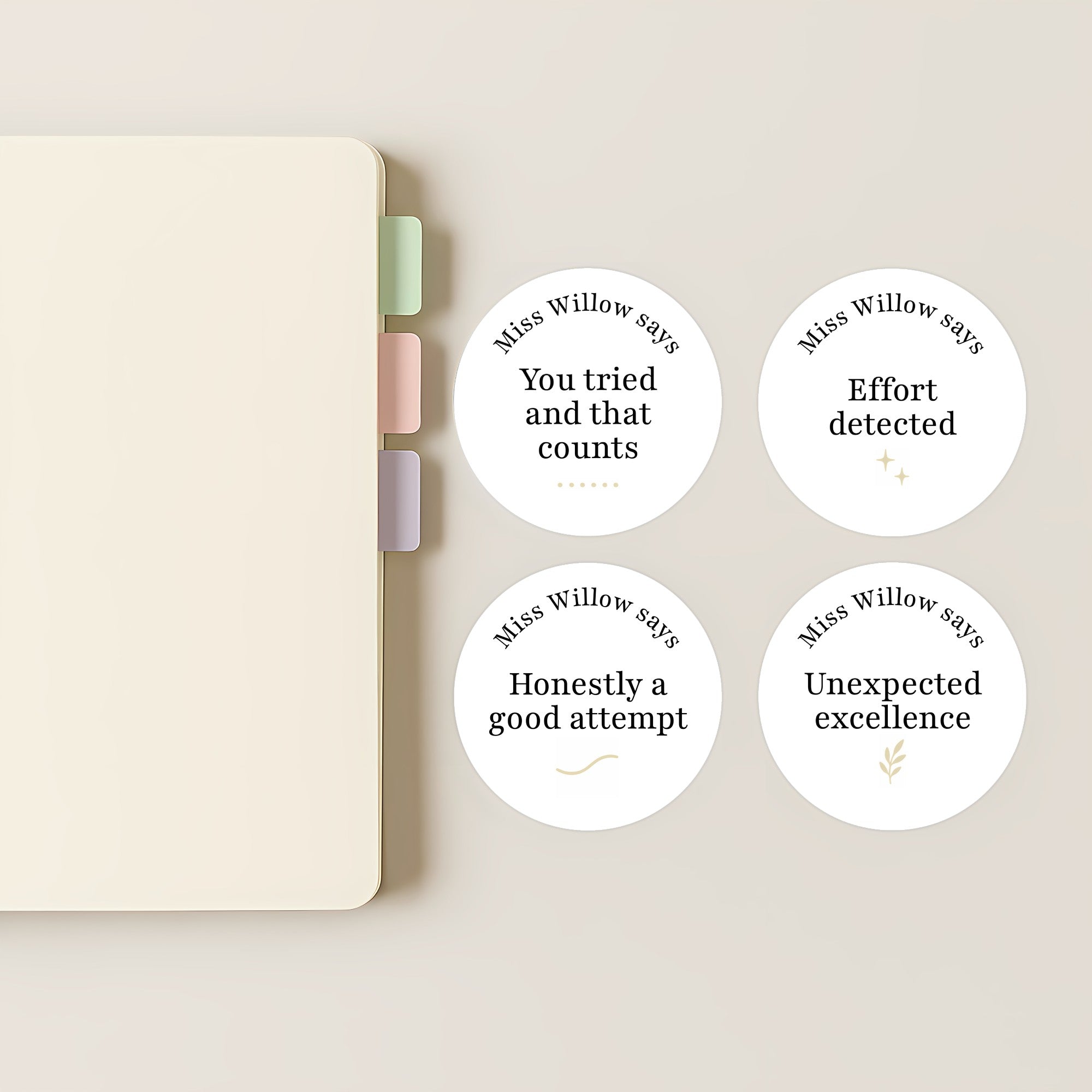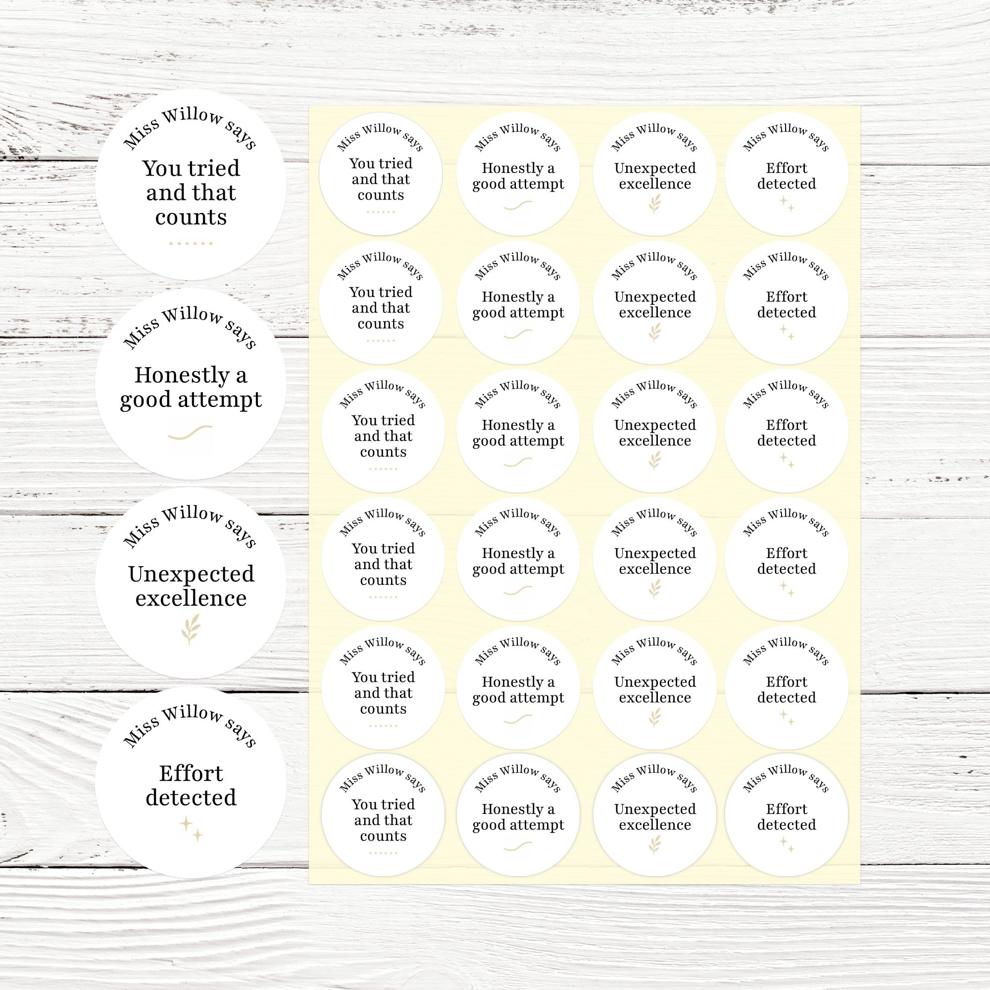 Each sticker includes your personalised name (e.g. “Miss Willow says”), creating a subtle, professional touch while still keeping things light and relatable for older students.