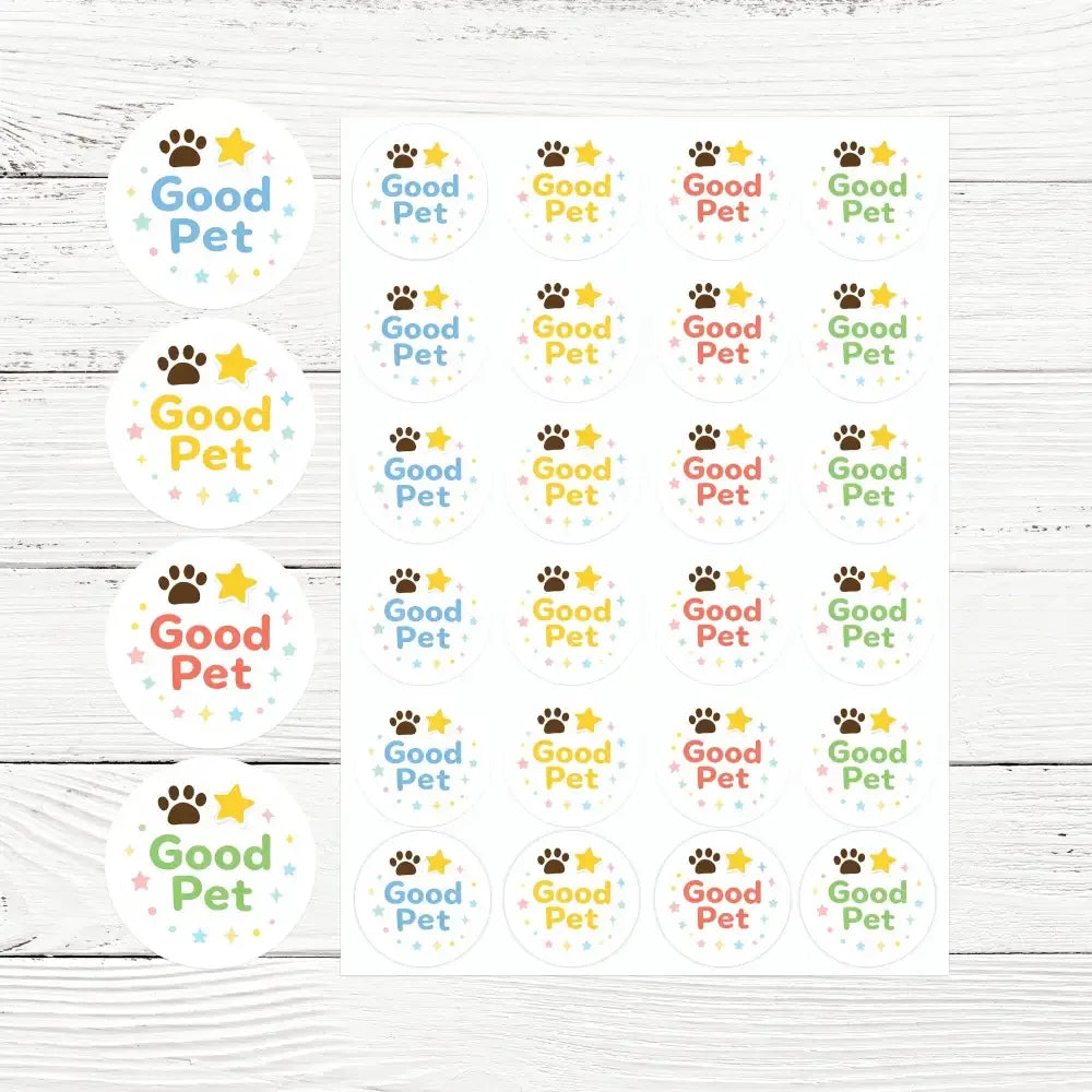Featuring the uplifting phrase “Good Pet” in playful rounded typography, each sticker is decorated with cute paw-print icons, stars, and soft pastel accents. The design is available in multiple friendly colour variations, making rewards feel fresh, joyful, and encouraging every time.