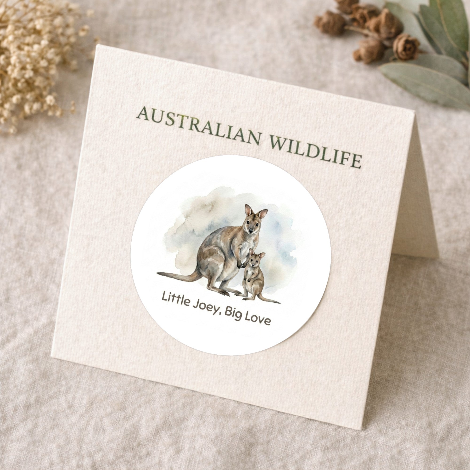 With gentle earthy tones and a calm, nurturing feel, this sticker is perfect for wildlife lovers, meaningful gifting, and nature-inspired stationery. A timeless design that honours Australia’s iconic marsupials and the bond they share.