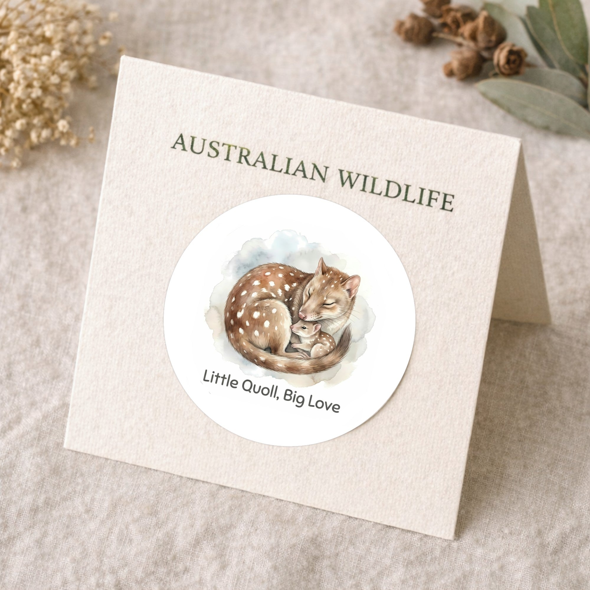 Celebrate the quiet beauty of Tasmania’s native wildlife with these premium “Little Quoll, Big Love” Tasmanian quoll stickers. Featuring a tender watercolour illustration of a mother quoll gently curled around her joey, this design captures softness, protection and deep maternal connection.