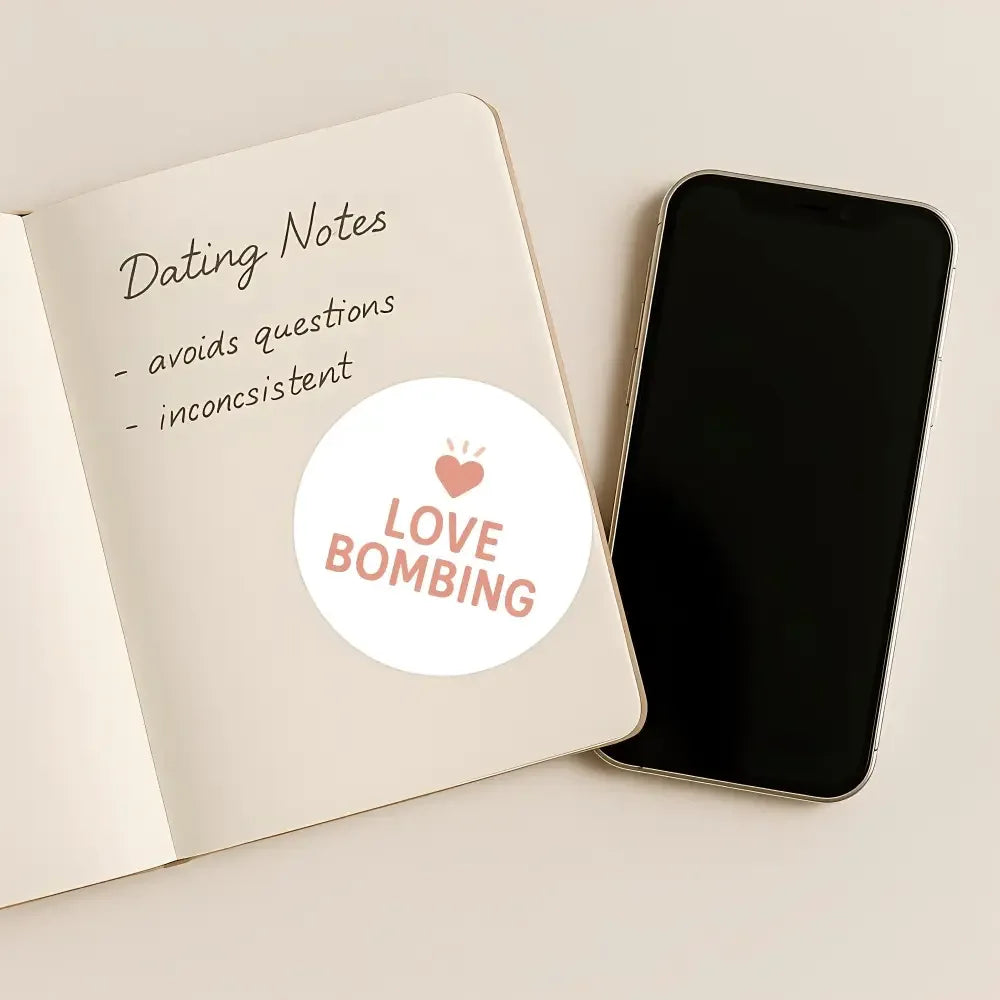 Call it out without over-explaining with these bold “LOVE BOMBING” round stickers, designed for modern dating awareness, emotional clarity, and self-protection.