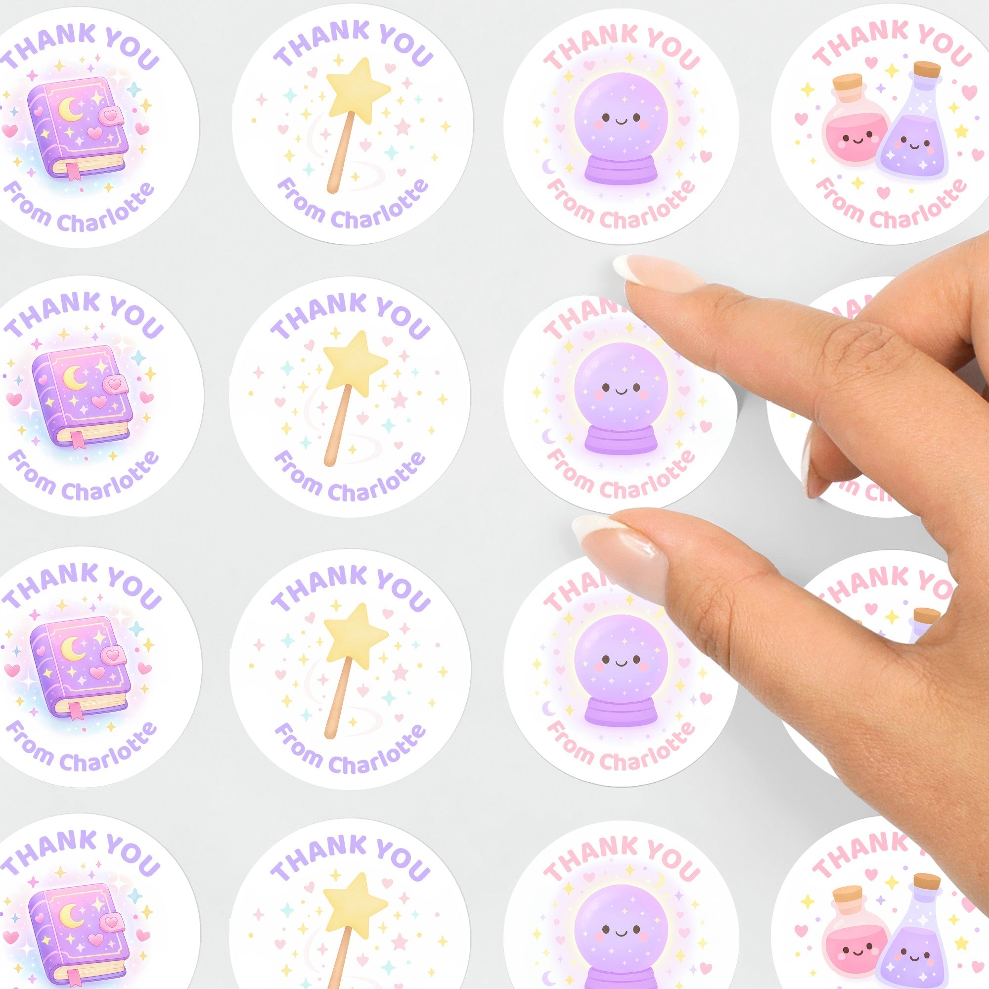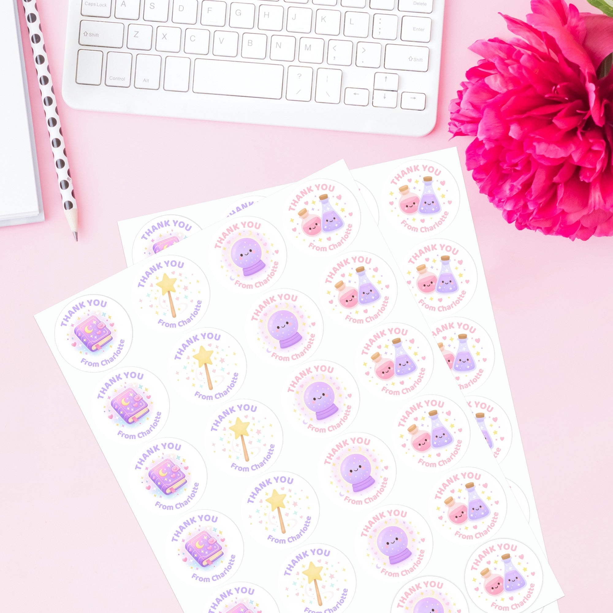Magic Theme Birthday Thank You Stickers – Spell Book, Potions, Wand & Crystal Ball | Personalised Party Favour Labels