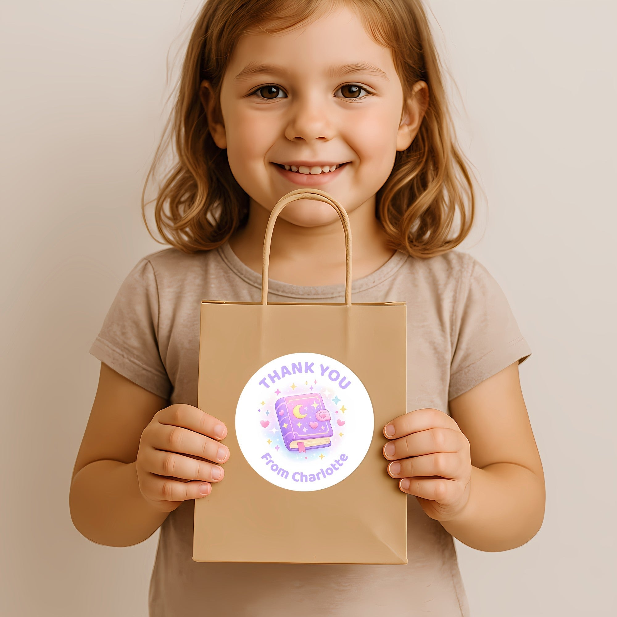 Make your party favours extra magical with this adorable Magic Theme Thank You Sticker Set! Featuring four cute designs, a spell book, pastel potions, a magic wand, and a smiling crystal ball, each sticker is personalised with your child’s name for the sweetest finishing touch to gift bags, boxes, jars and party treats.