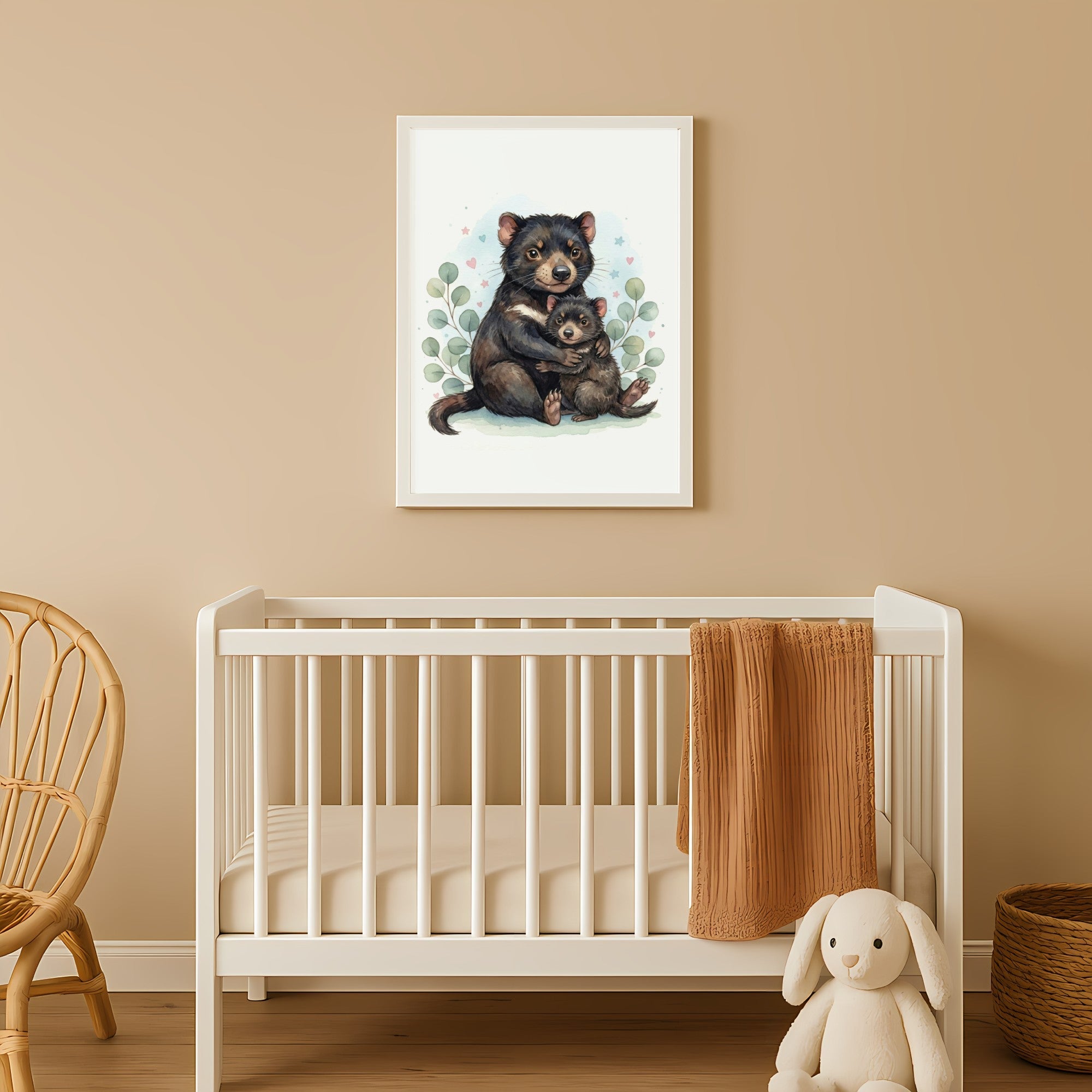 Celebrate Australia’s unique wildlife with this adorable Mama & Baby Tasmanian Devil wall art print. Featuring a tender Tassie devil parent cuddling their little joey in soft watercolor tones, this artwork adds warmth, love, and native character to any nursery. Perfect for Aussie-themed baby rooms, woodland nurseries, gender-neutral spaces, and nature-inspired décor, it brings gentle storytelling charm into your child’s space.