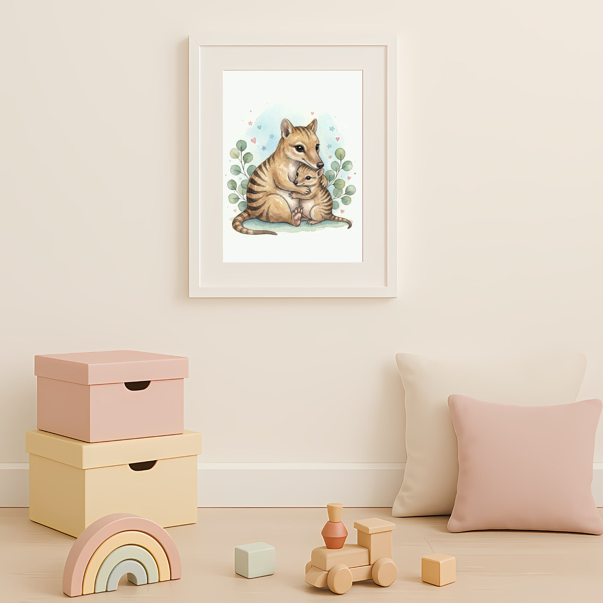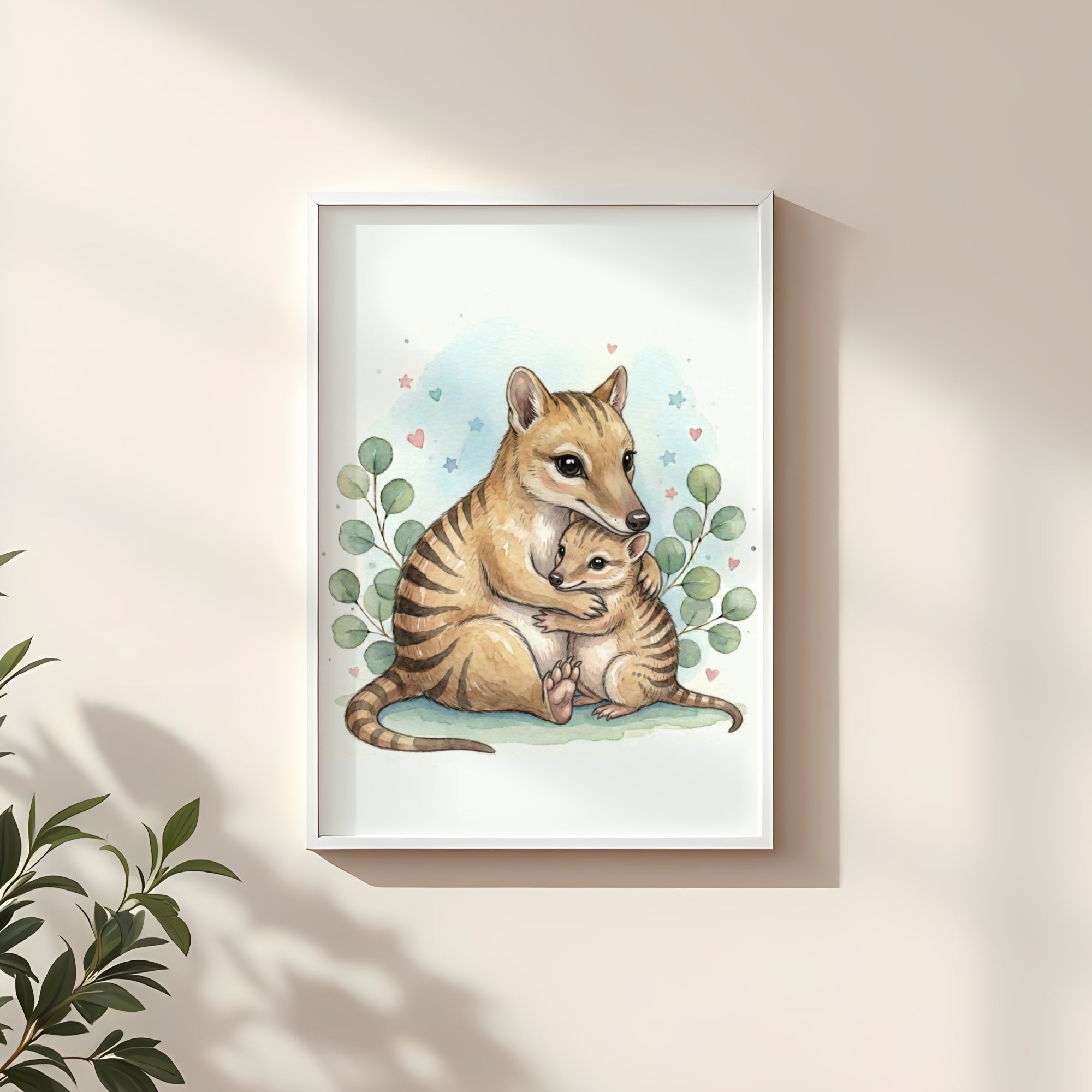 Mama & Baby Thylacine Nursery Print – Tasmanian Tiger Wall Art, Australian Animal Decor, Watercolour Thylacine Artwork, Printable Kids Room Poster