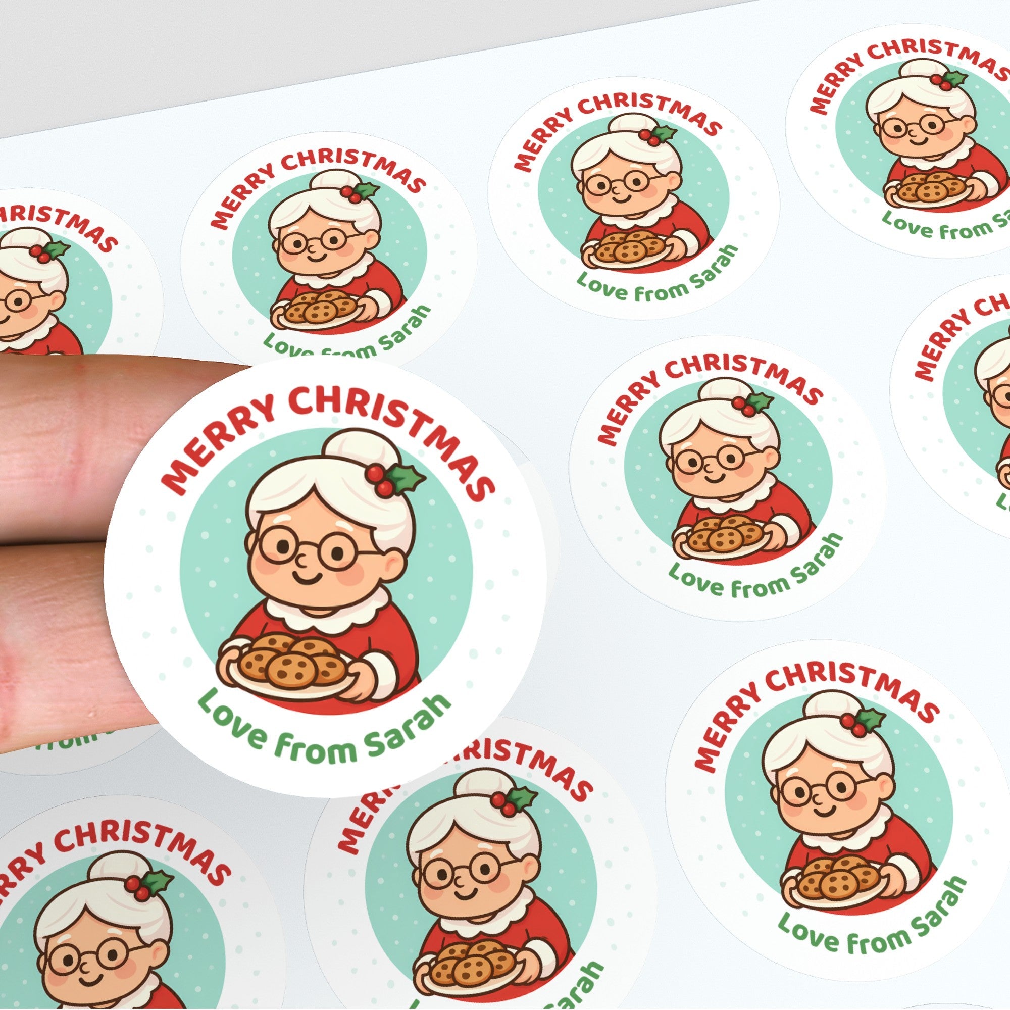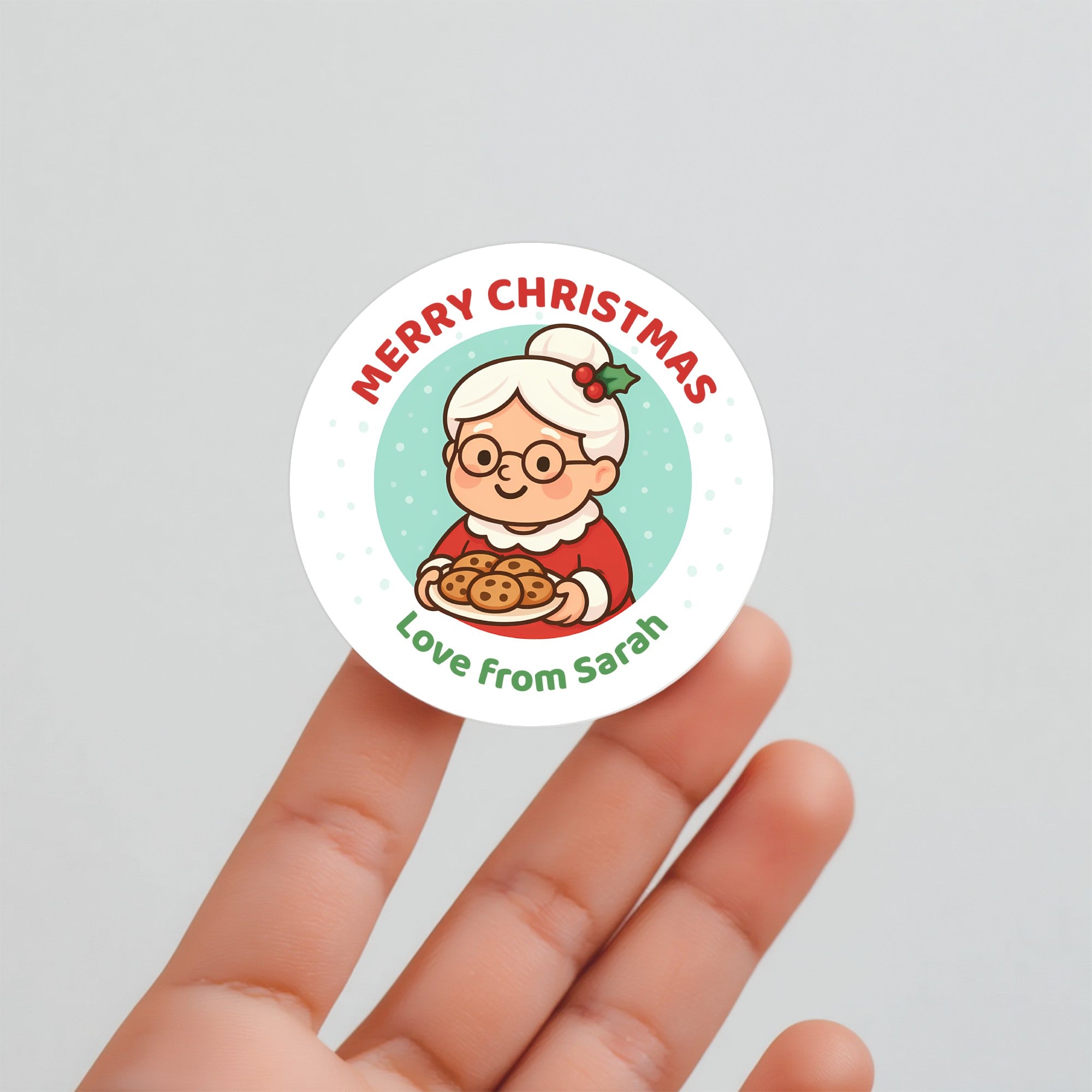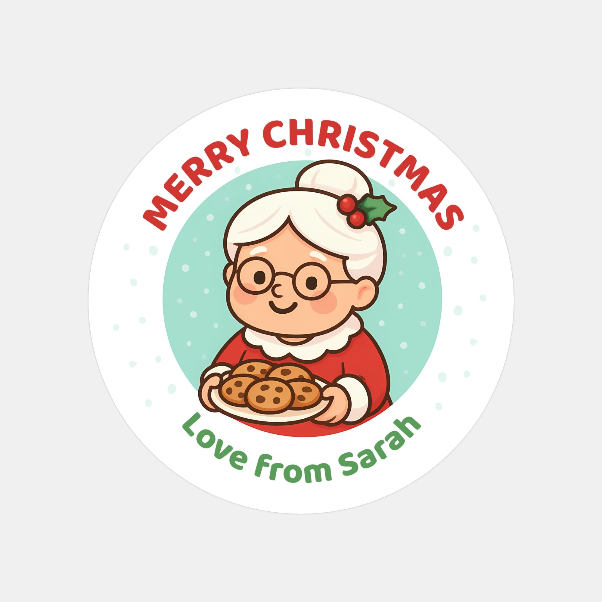 Add a warm, cosy touch to your Christmas gifts with our Personalised Mrs Claus Christmas Stickers. Featuring a sweet Mrs Claus holding a tray of cookies, this cheerful design is perfect for kids’ presents, class gifts, Christmas Eve boxes and festive treat bags.