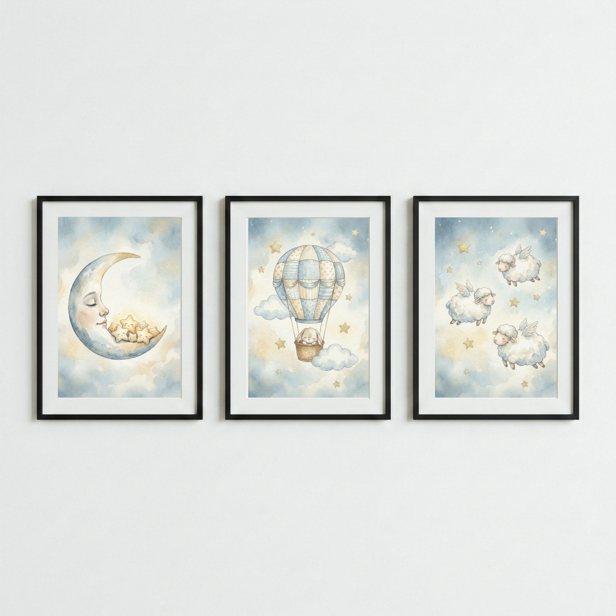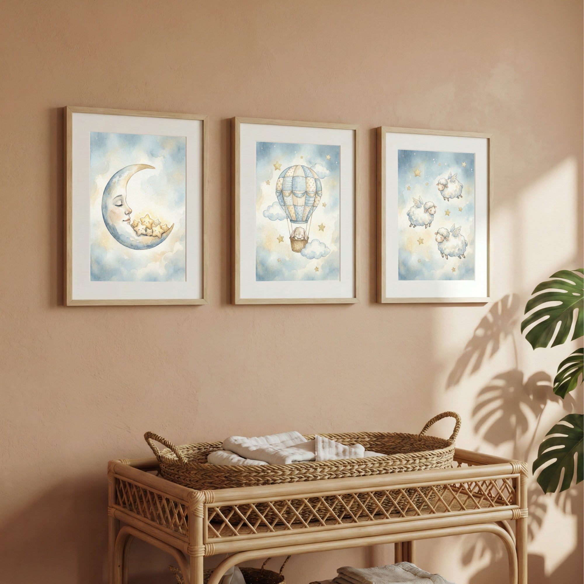 Celestial Nursery Wall Art Set of 3 – Moon, Hot Air Balloon & Flying Sheep Watercolour Prints – Neutral Baby Decor