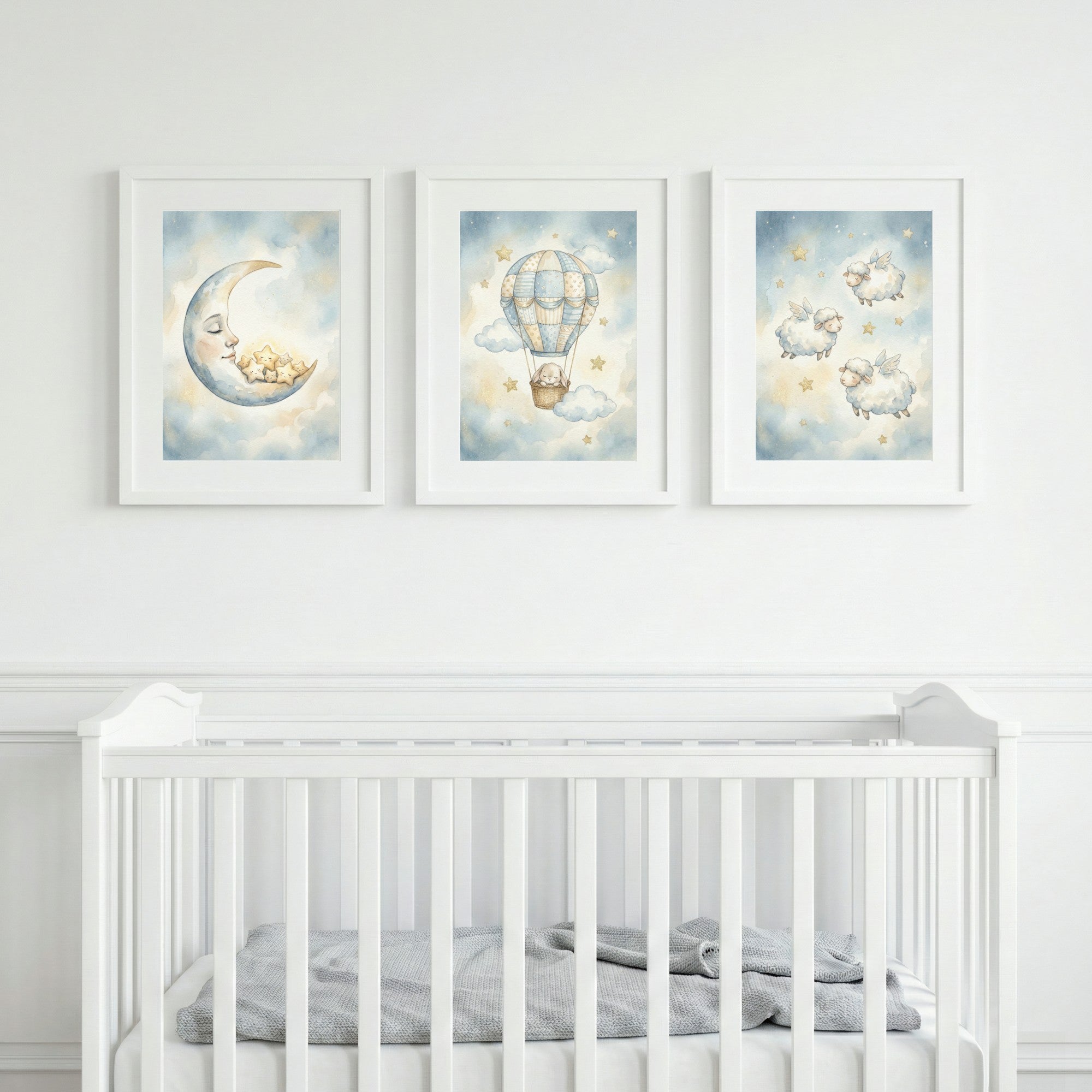 - Set Includes: Three unique and charming designs: Moon & Stars, Hot Air Balloon, and Flying Sheep. Each piece offers a different celestial element that complements the others perfectly. Together they create a cohesive feel to your nursery wall art collection.