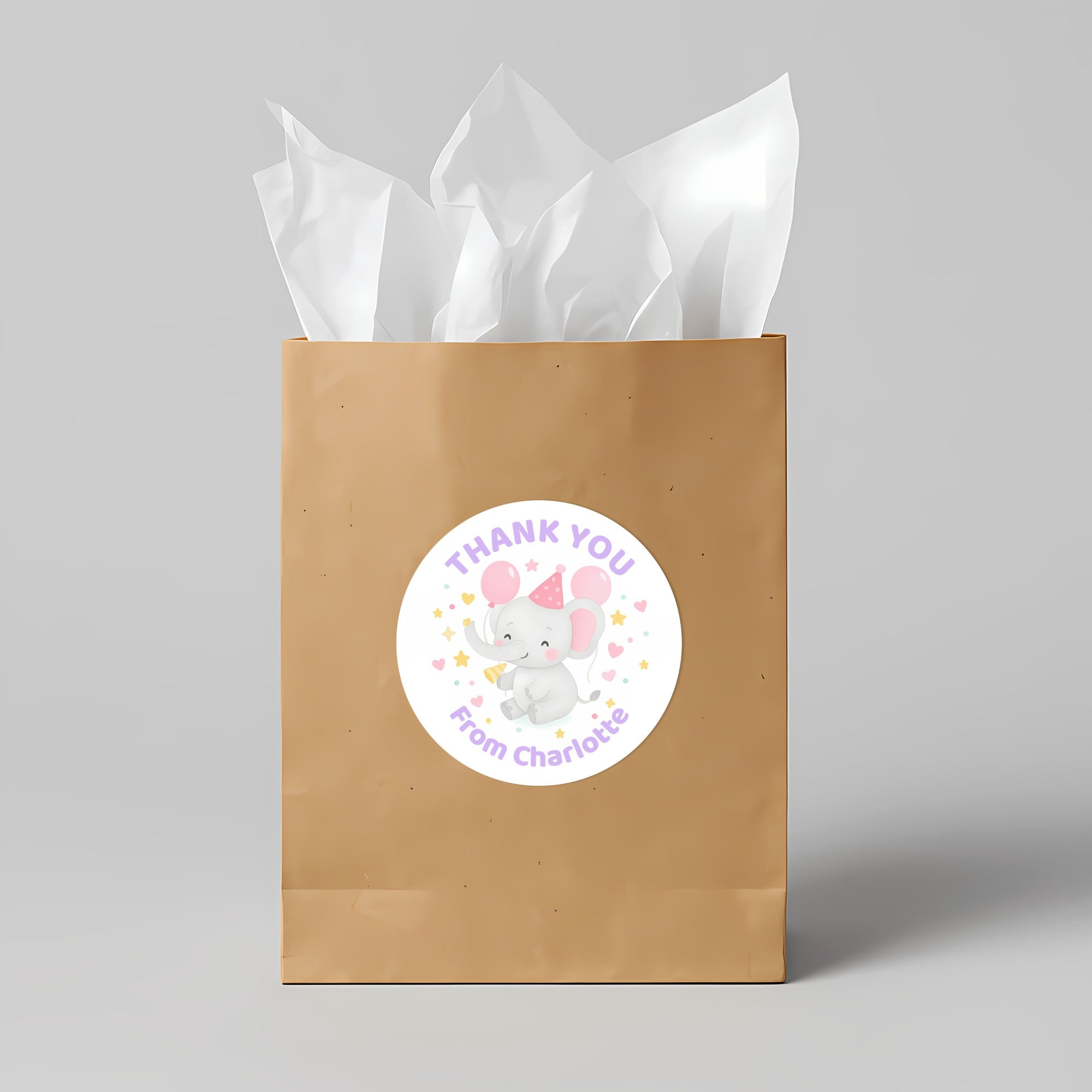 Pastel Elephant Thank You Stickers – Custom Name Kids Birthday Party Favour Labels