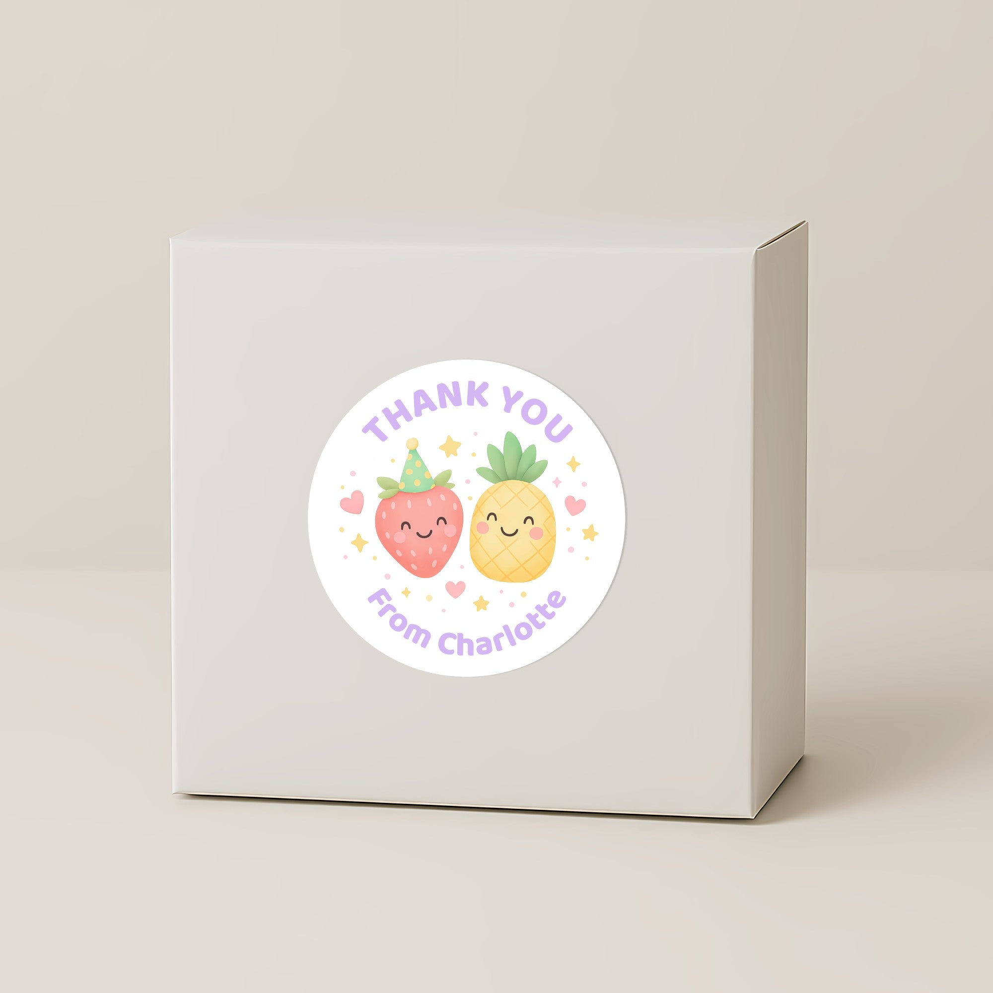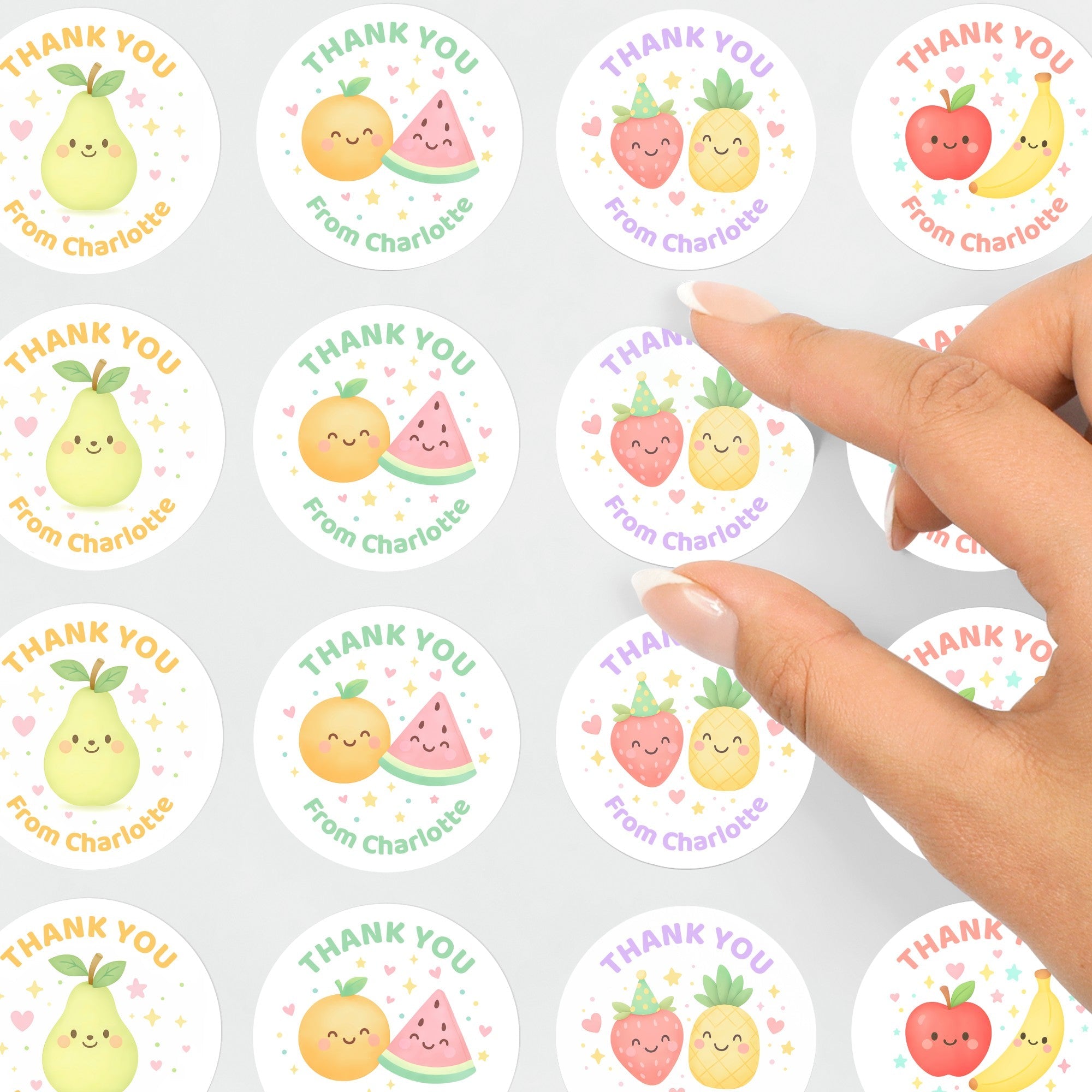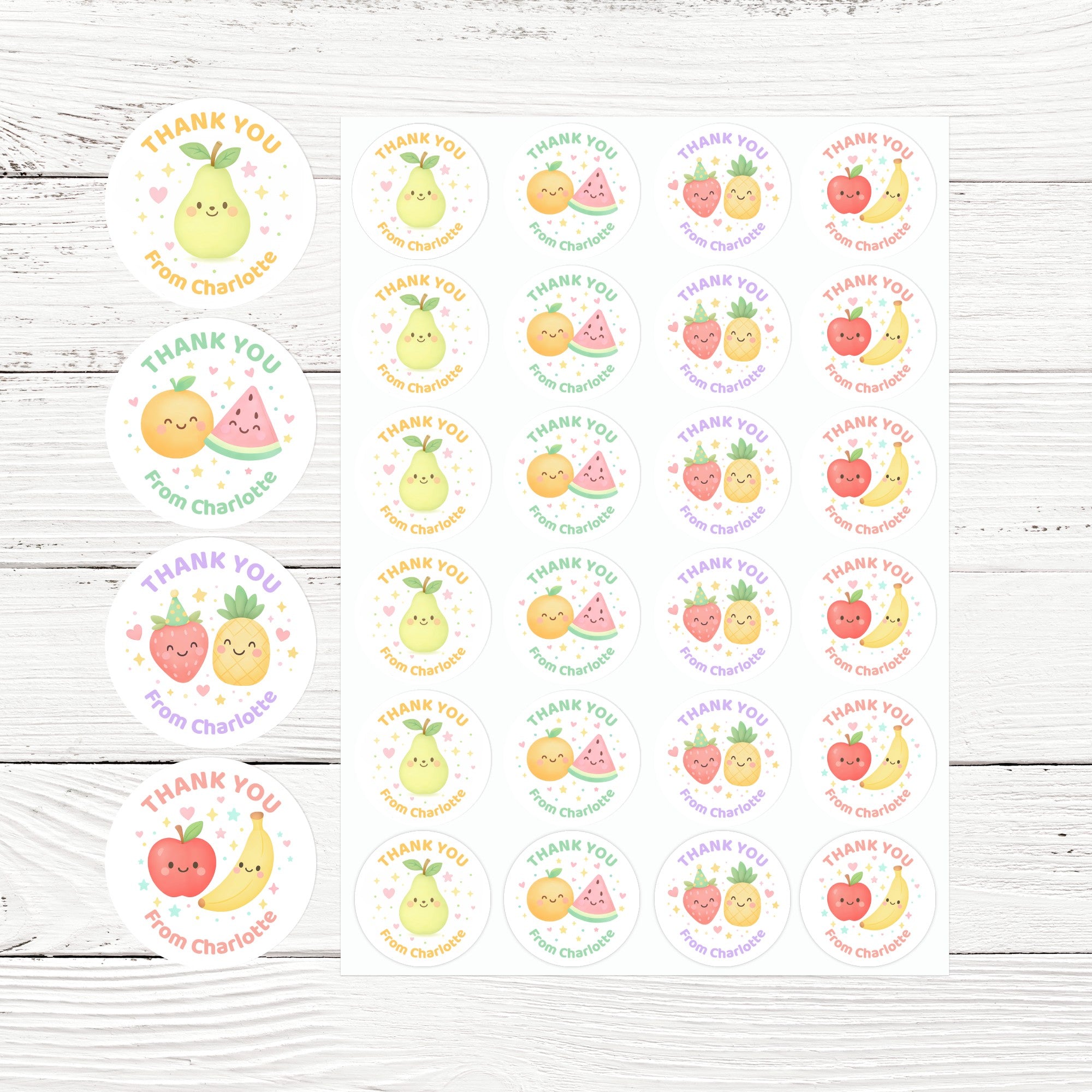 Pastel Fruit Thank You Stickers – Set of 4 Designs – Custom Name Kids Birthday Party Favour Labels
