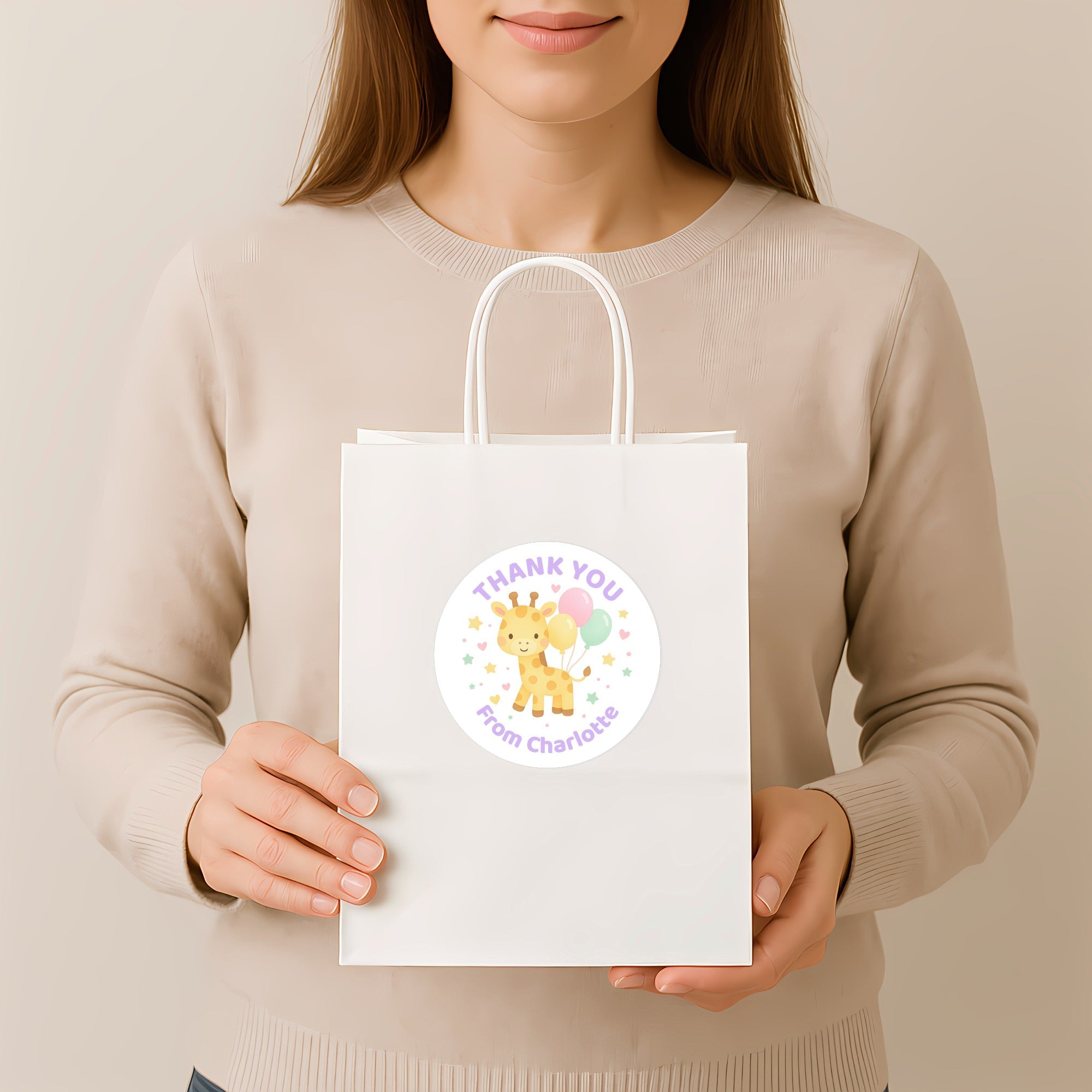 Pastel Giraffe Thank You Stickers – Custom Name Kids Birthday Party Favour Labels