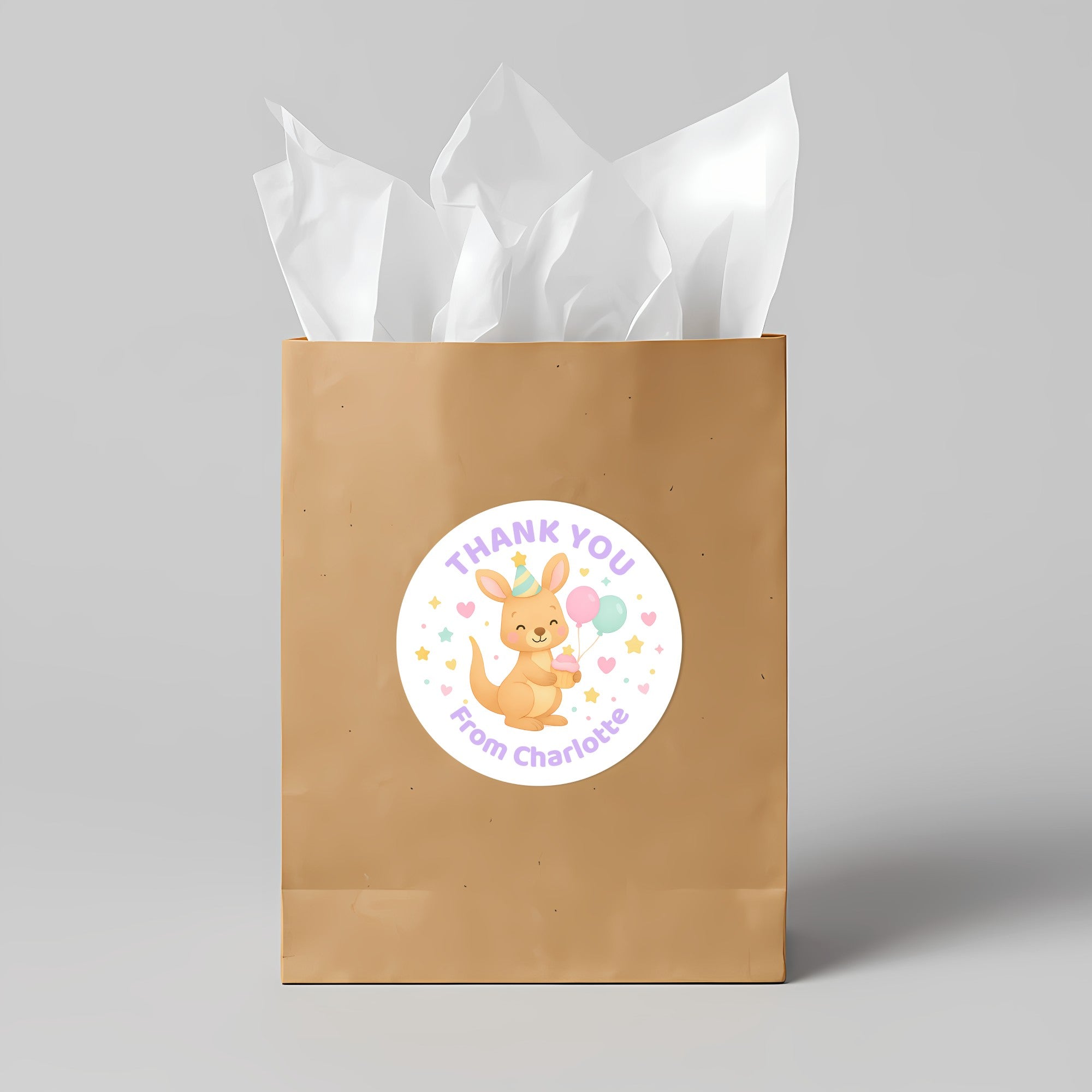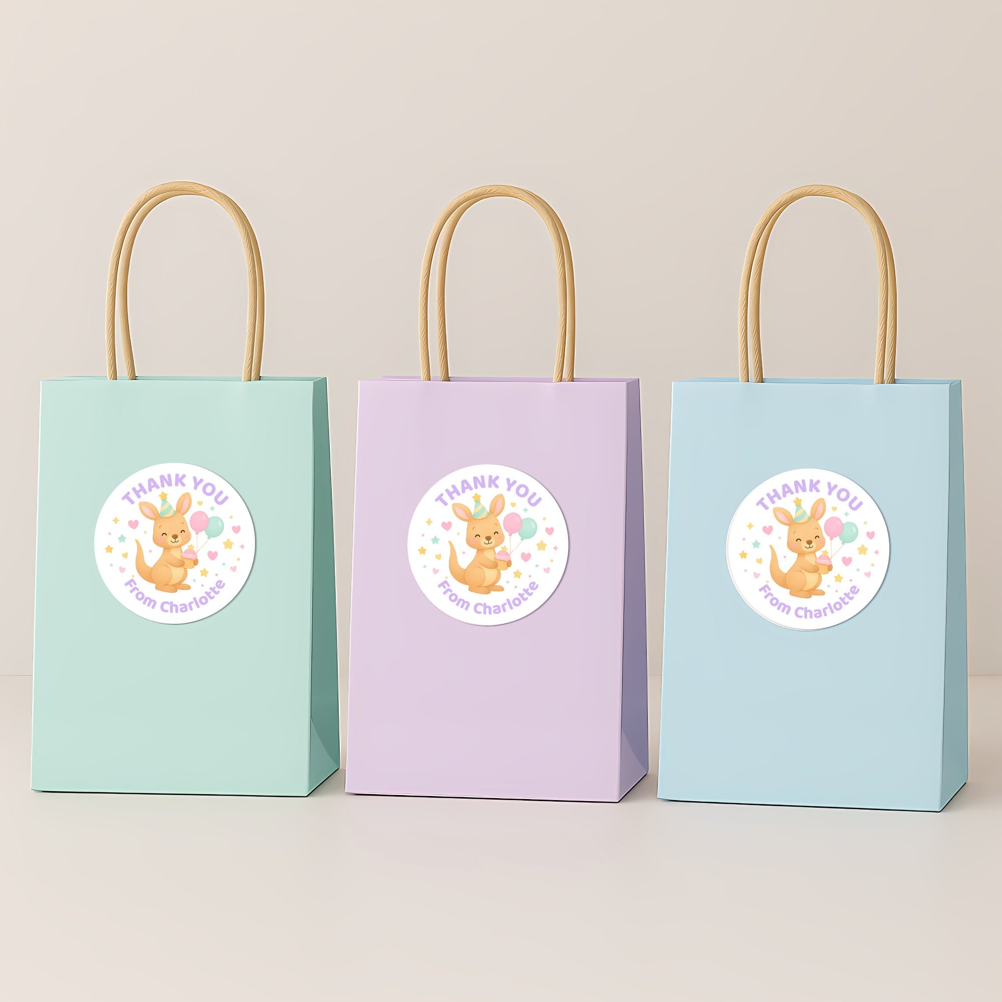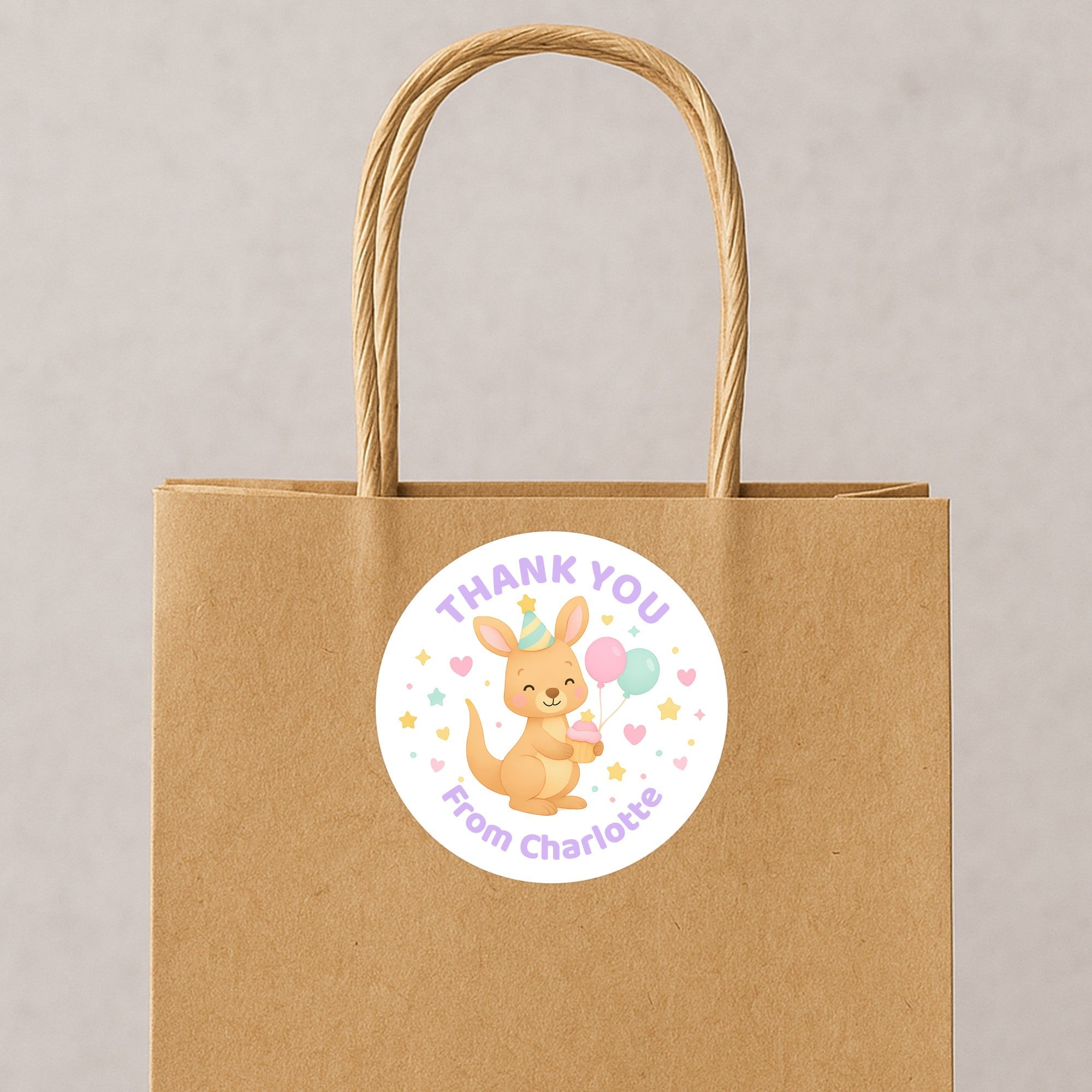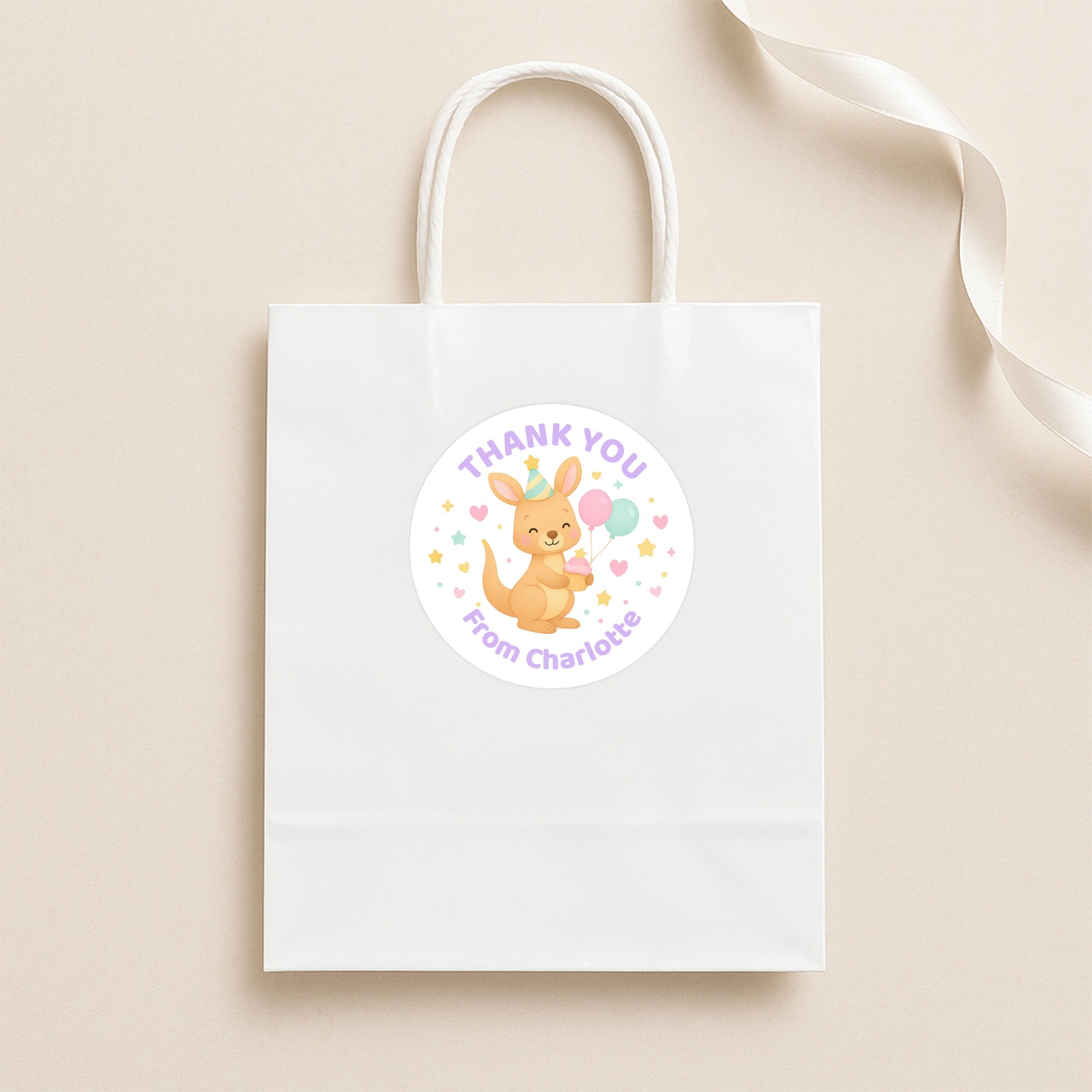 Pastel Kangaroo Thank You Stickers – Custom Name Kids Birthday Party Favour Labels