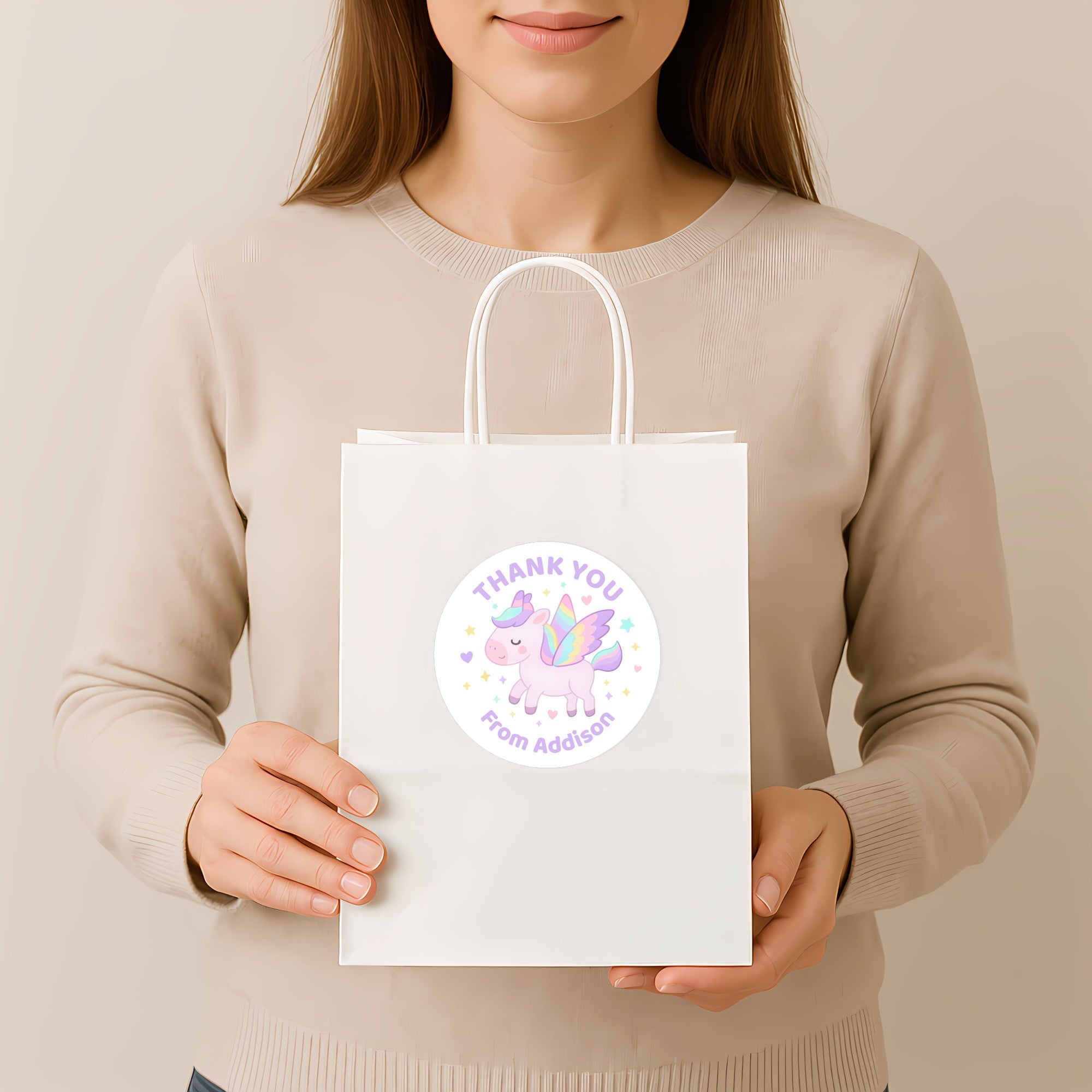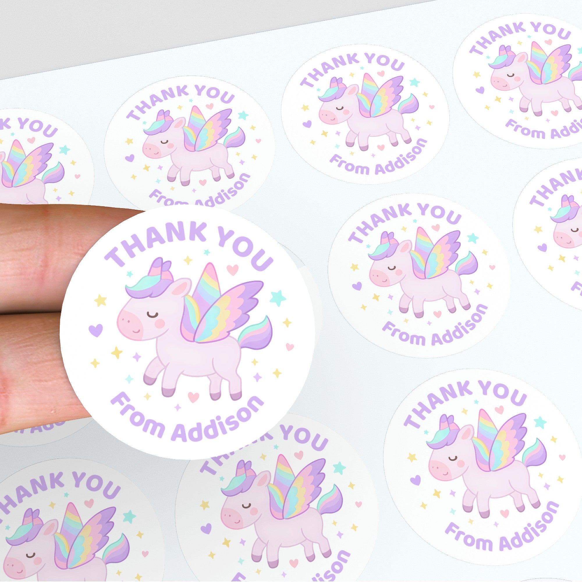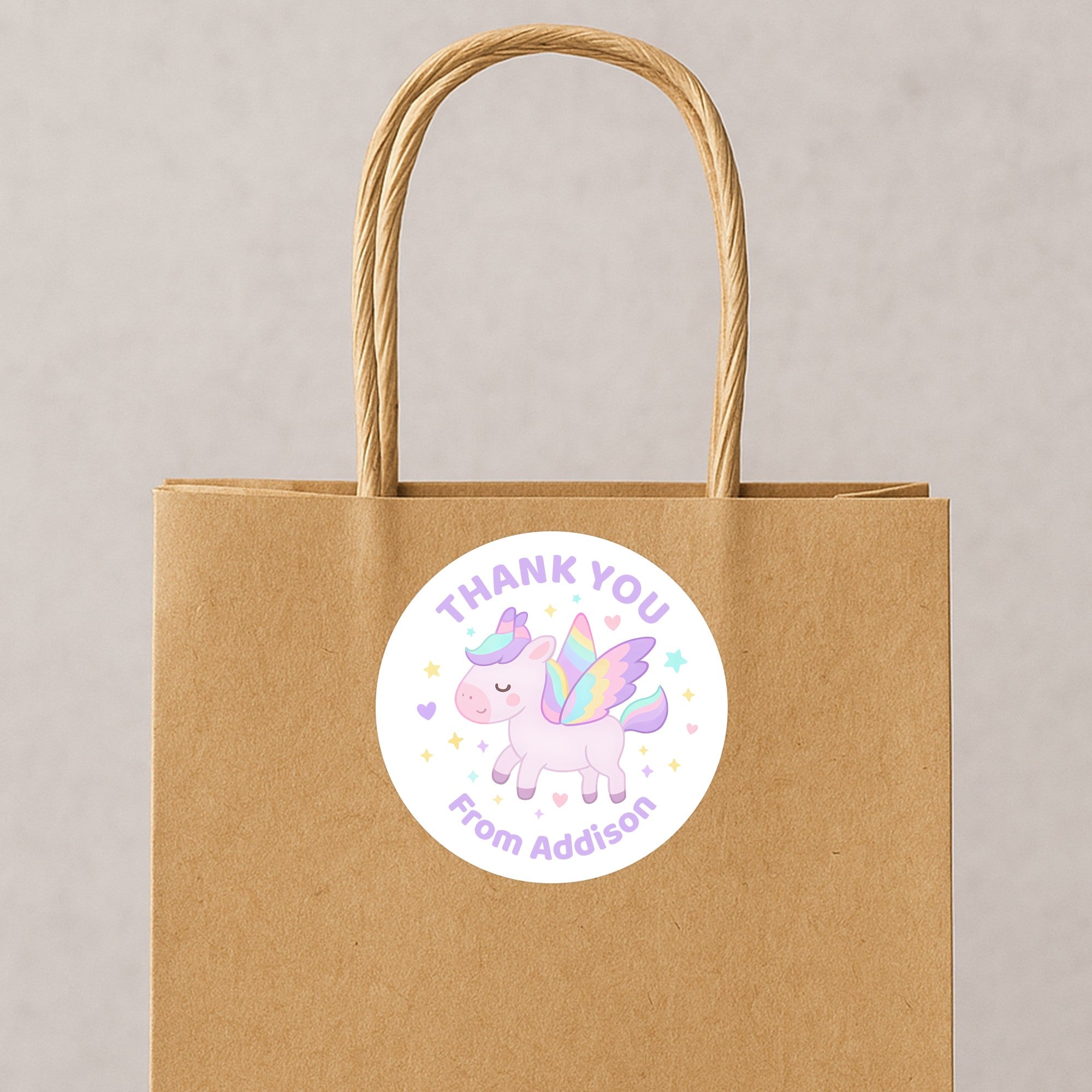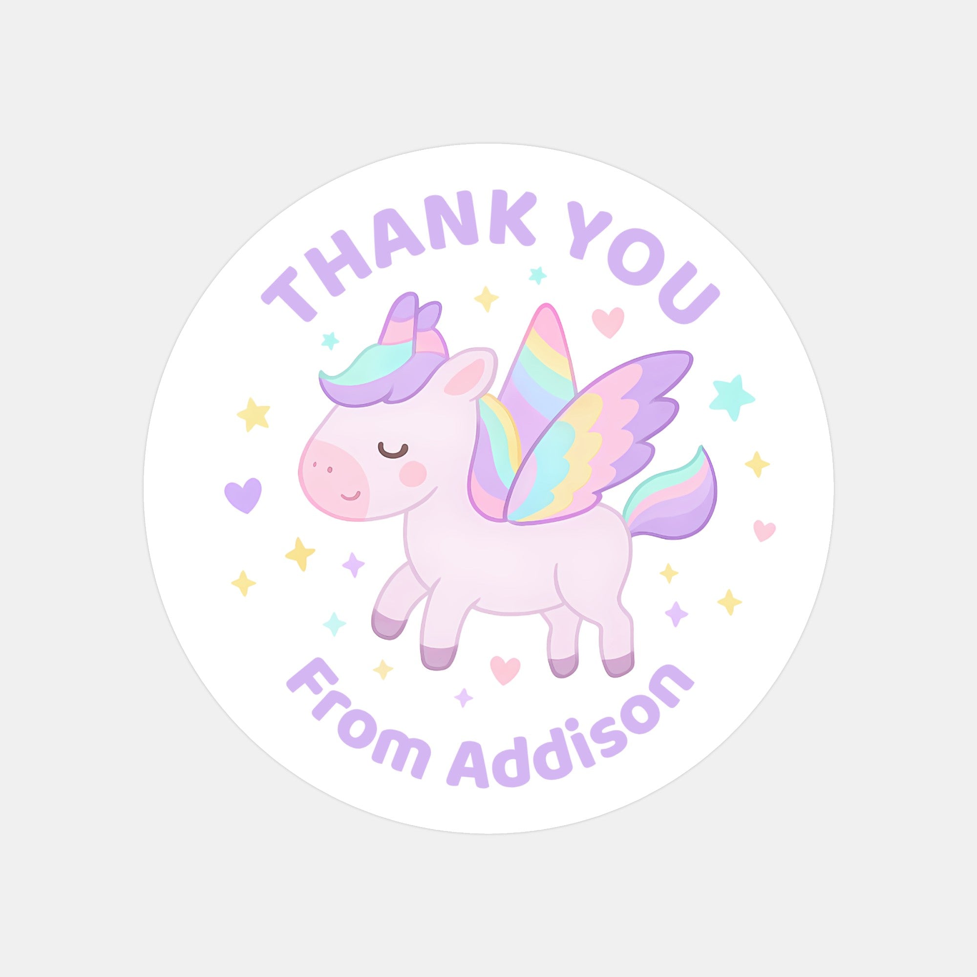 Pastel Pegasus Thank You Stickers – Custom Name Kids Birthday Party Favour Labels