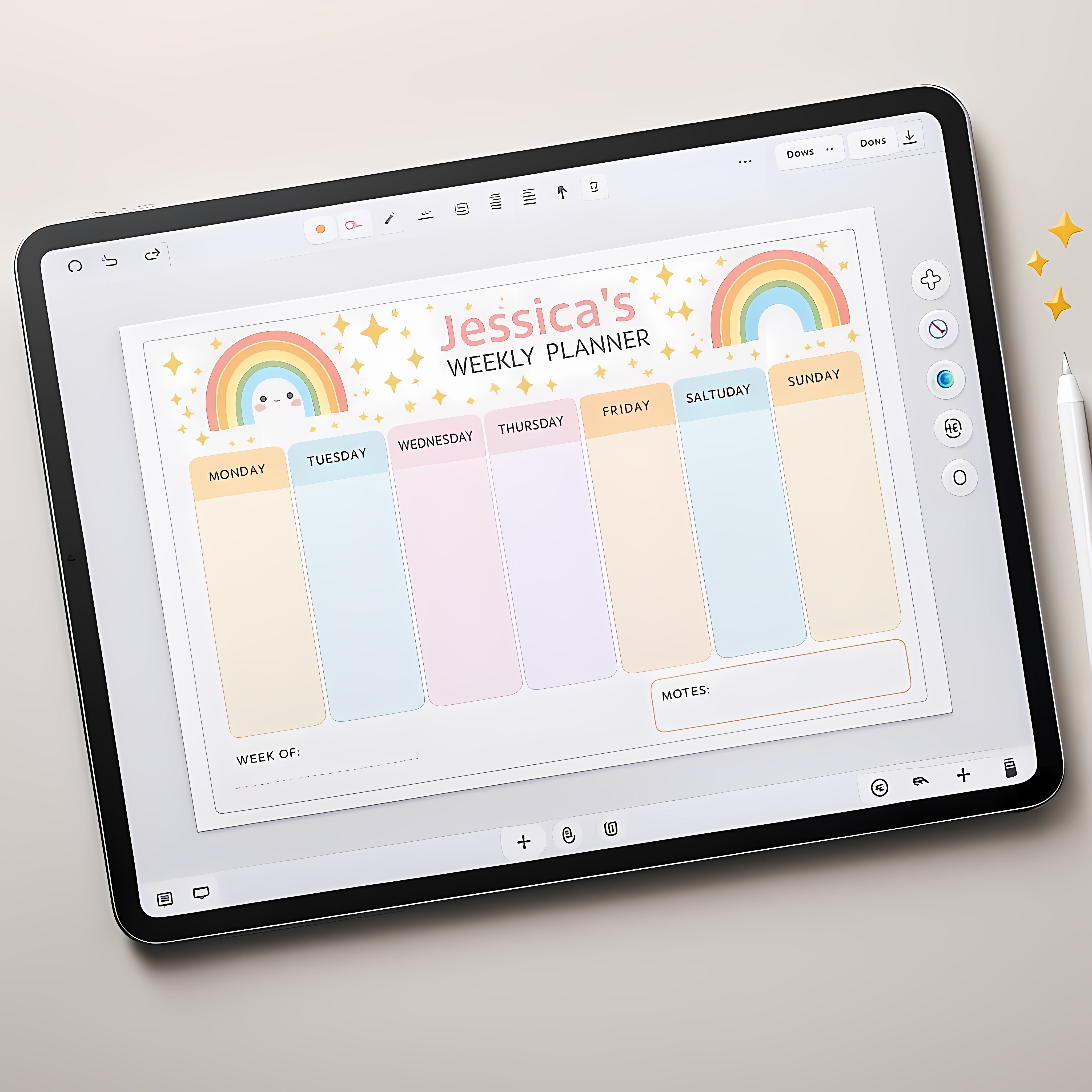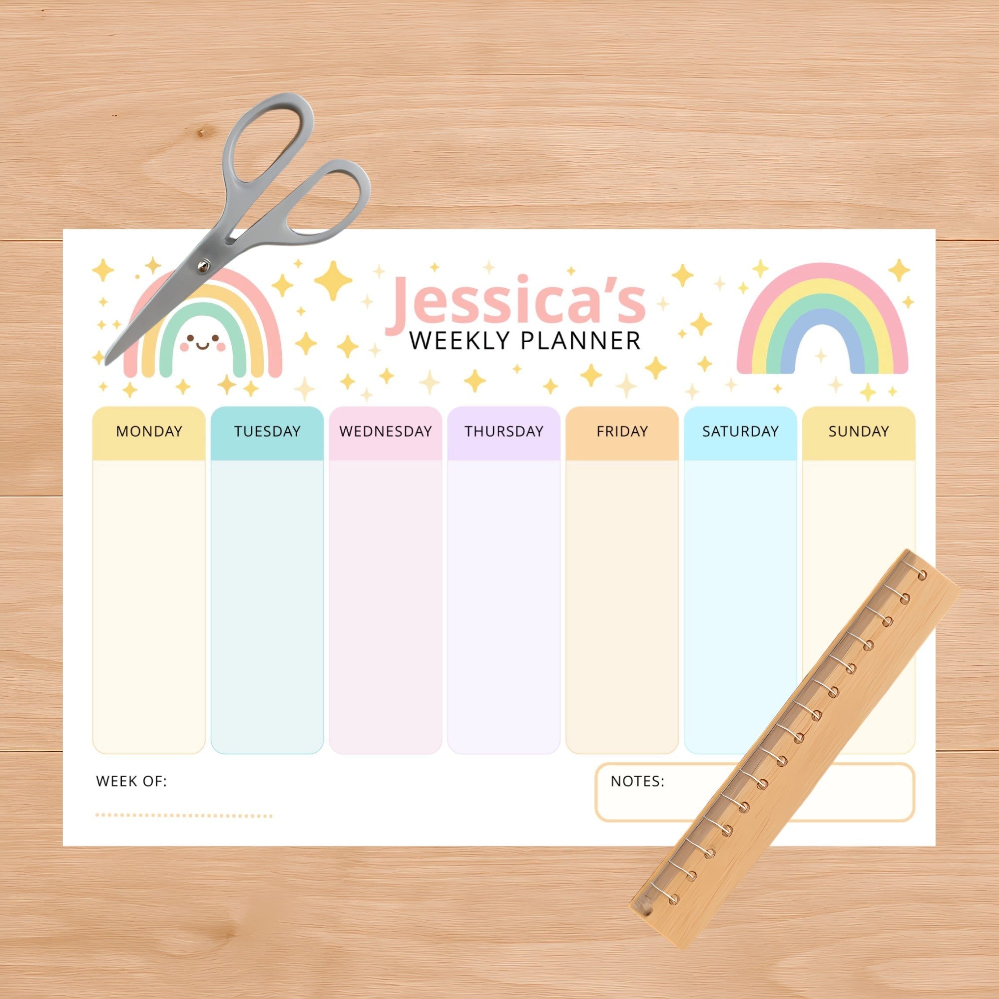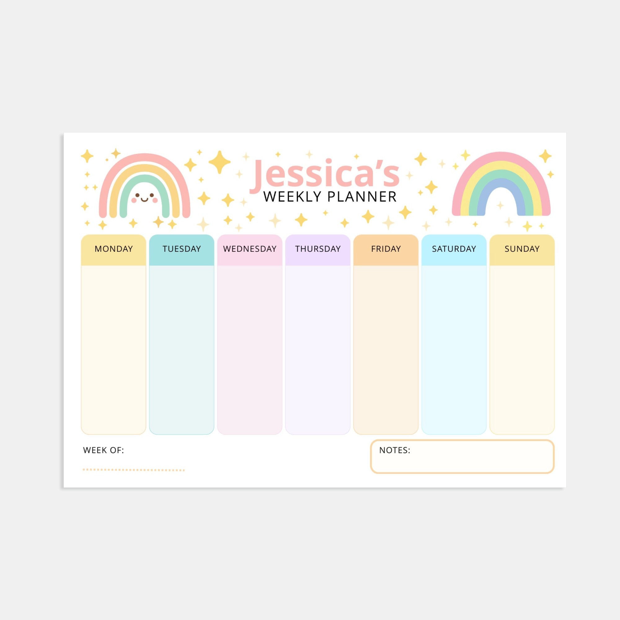 Pastel Rainbow Kids Weekly Planner – Editable Name & Title (A4, A3 & US Letter)