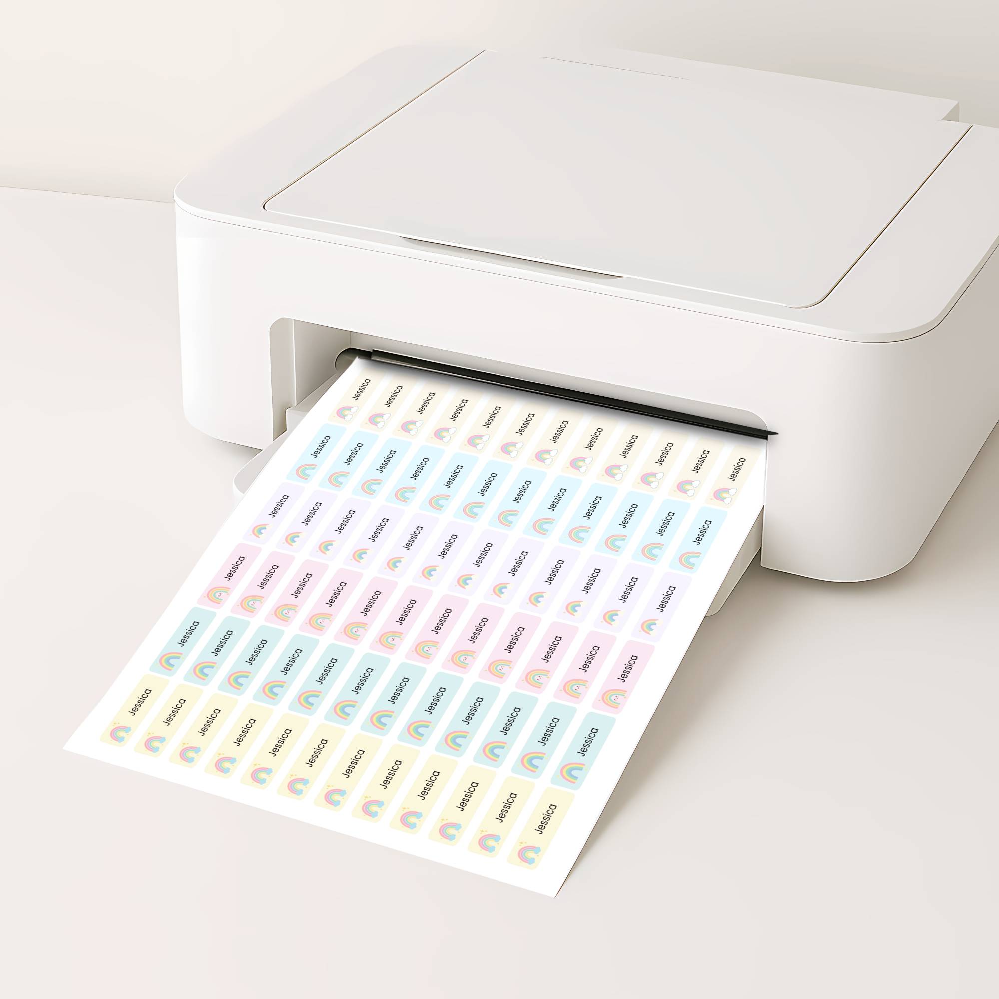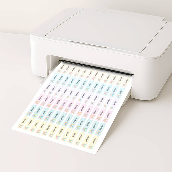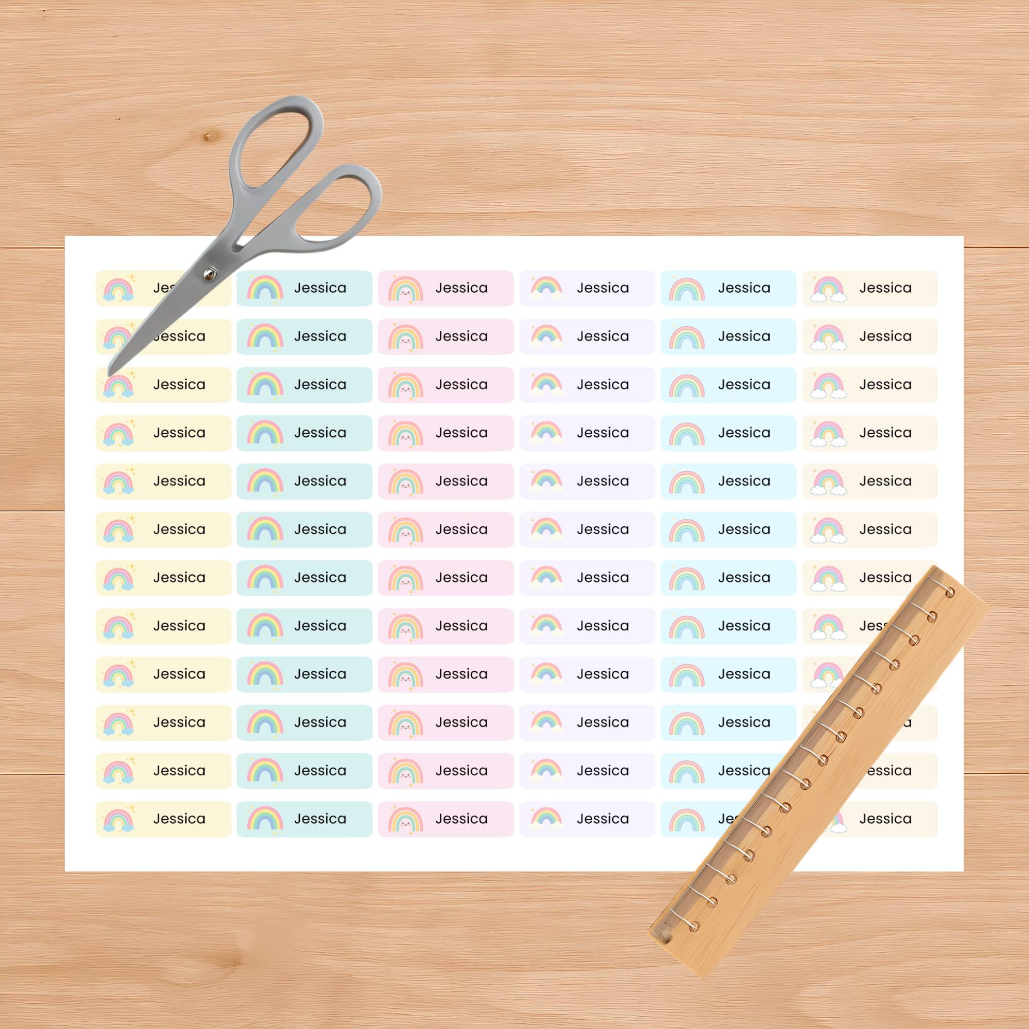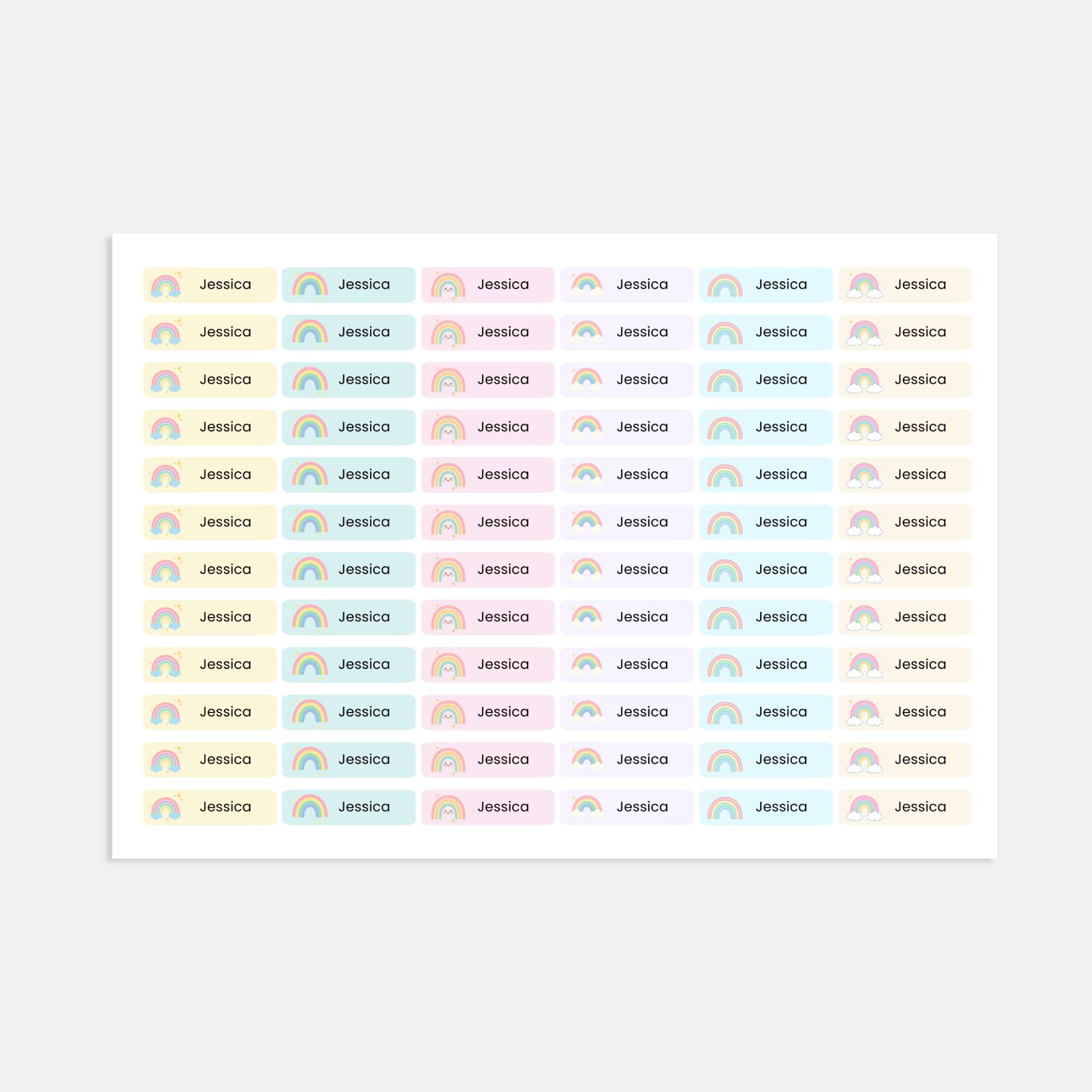 Each label features a cute pastel rainbow icon paired with matching soft rainbow background colours across the sheet. The slim 45×12mm format is perfect for pencils and stationery, and the clean modern font keeps your child’s name clear and easy to read. The pastel palette and rainbow artwork create a beautifully coordinated, kid-friendly look that matches any school or daycare supplies.