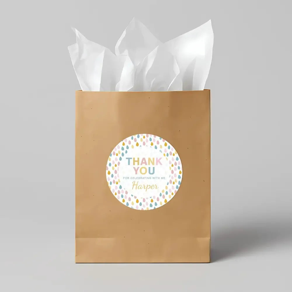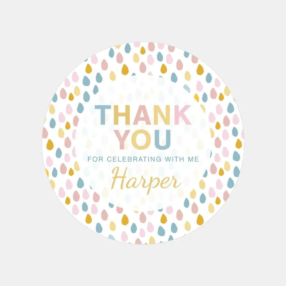 Featuring soft multi-colour droplets and your child’s personalised name, they’re the perfect finishing touch for lolly bags, party boxes, jars, envelopes or gifts.