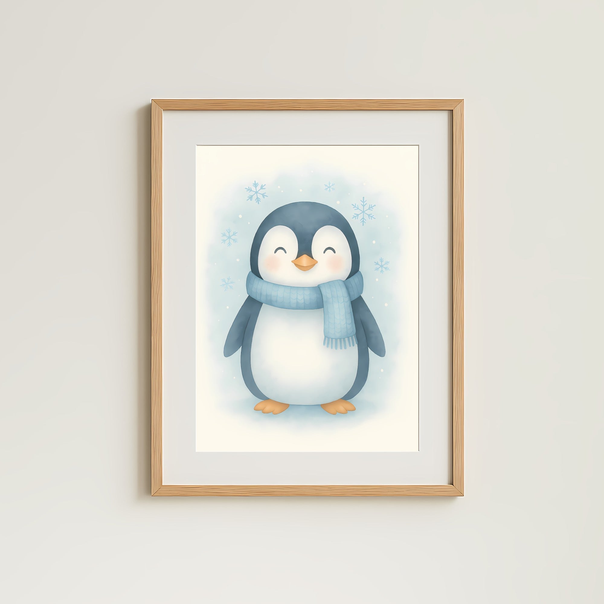 Add a touch of winter magic to your nursery with this Little Penguin Nursery Wall Art Print, featuring a happy penguin wearing a blue scarf surrounded by gentle snowflakes.